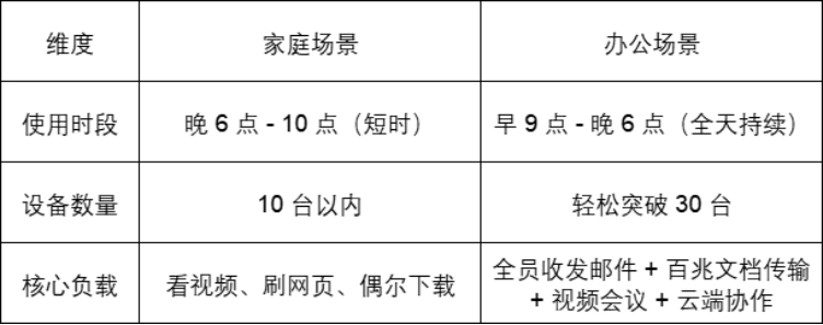 家用路由器的核心定位是 “休息场景”,而办公场景是 “持续高负载”,两者差异显著: