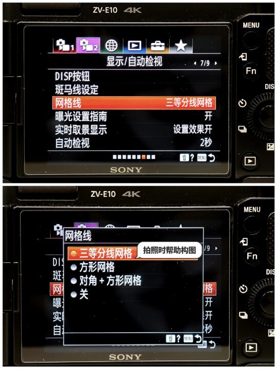 1️⃣ 我拍照用的最多的就是三分线构图法,而我们的相机是可以打开这个功能的→如图2️⃣,这样就可以方便我们拍摄的时候构图了,非常实用!