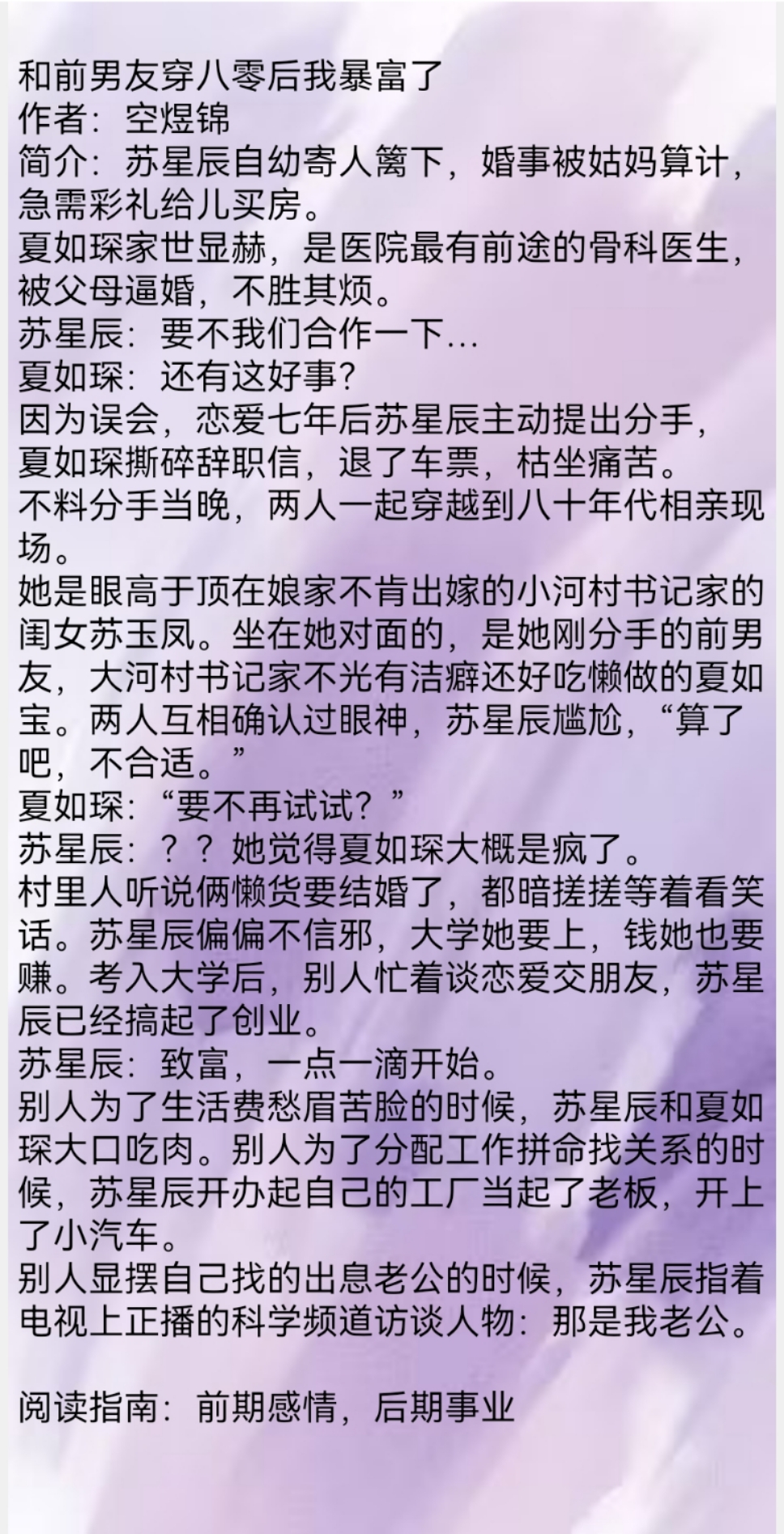 《和前男友穿八零后我暴富了》作者:空煜锦文章字数:432565字(完结)