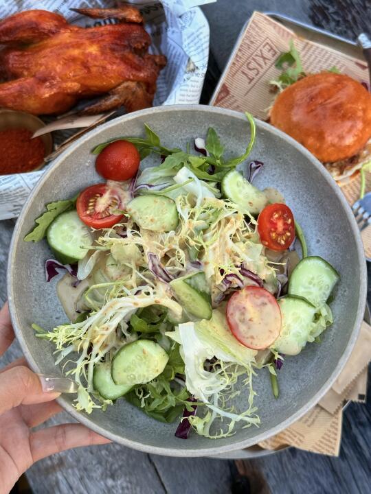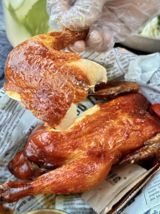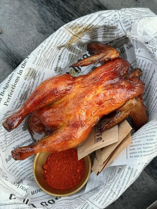上桌时香气就直钻鼻腔。外皮烤得金黄酥脆,像琉璃般泛着诱人光泽,轻轻一咬,“咔嚓”一声超带感,内里鸡肉鲜嫩多汁,每一丝肉都饱含着独特香料腌制后的醇厚风味,好吃到吮手指。