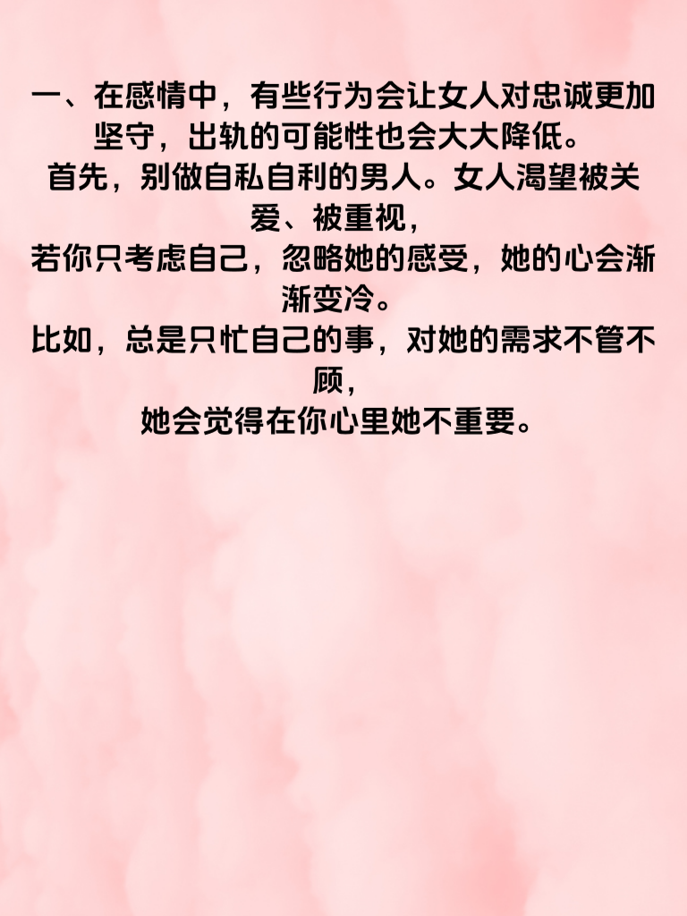 一、在感情中,有些行为会让女人对忠诚更加坚守,出轨的可能性也会大大降低。首先,别做自私自利的男人。女人渴望被关爱、被重视,若你只考虑自己,忽略她的感受,她的心会渐渐变冷。比如,总是只忙自己的事,对她的需求不管不顾,她会觉得在你心里她不重要。 二、也别做毫无担当的男人。遇到问题就逃避,不敢承担责任,会让女人失去安全感。比如生活中遇到困难,你总是退缩,她会对这段感情失去信心。一个有担当的男人,才能给她稳稳的依靠,让她安心与你走下去。 三、更不要做不懂尊重的男人。不尊重她的想法、喜好和隐私,会让她感到被冒犯。比如随意翻看她的手机,对她的决定横加指责,她会觉得没有被尊重,从而对这段感情产生不满。尊重是感情的基石,只有做到尊重,女人才会更珍惜这段感情,减少出轨的可能。
