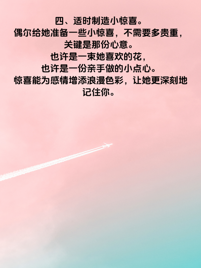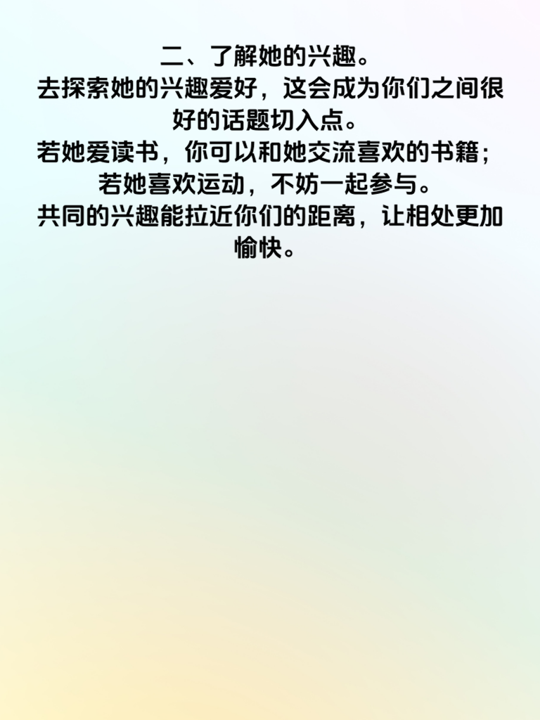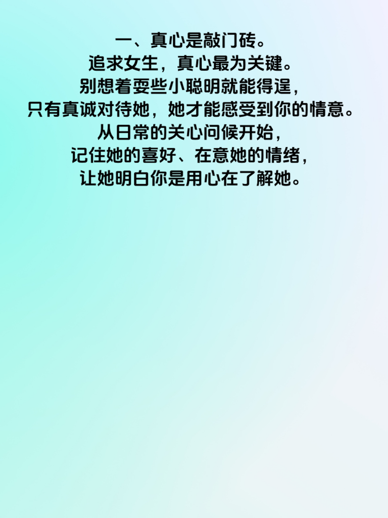 一、真心是敲门砖。追求女生,真心最为关键。别想着耍些小聪明就能得逞,只有真诚对待她,她才能感受到你的情意。从日常的关心问候开始,记住她的喜好、在意她的情绪,让她明白你是用心在了解她。 二、了解她的兴趣。去探索她的兴趣爱好,这会成为你们之间很好的话题切入点。若她爱读书,你可以和她交流喜欢的书籍;若她喜欢运动,不妨一起参与。共同的兴趣能拉近你们的距离,让相处更加愉快。 三、保持自信与尊重。自信的你会散发独特魅力,但别过度自负。尊重她的想法、选择和感受,不强迫她做任何事。在她面前展现出成熟、可靠的一面,让她对你产生信任。 四、适时制造小惊喜。偶尔给她准备一些小惊喜,不需要多贵重,关键是那份心意。也许是一束她喜欢的花,也许是一份亲手做的小点心。惊喜能为感情增添浪漫色彩,让她更深刻地记住你。