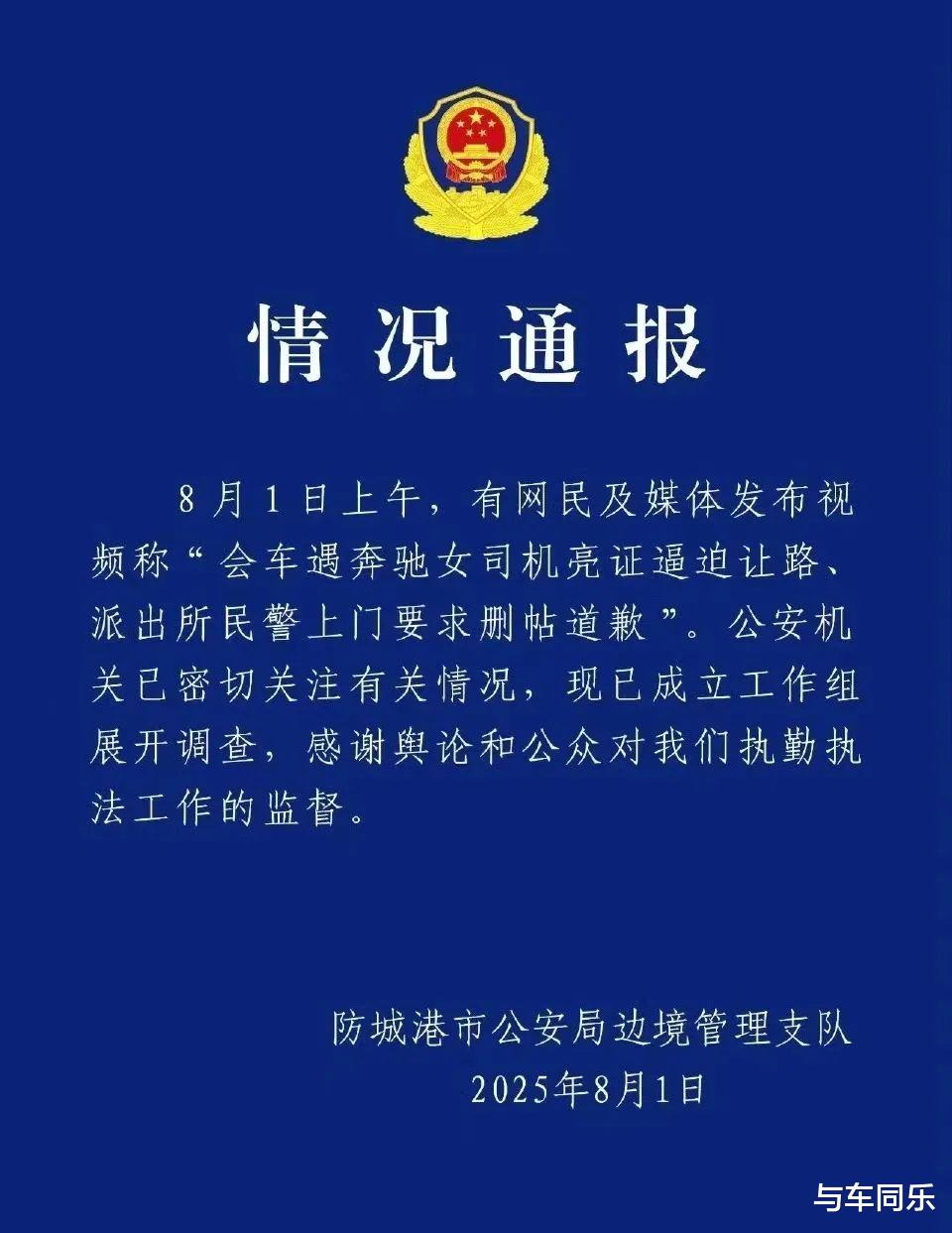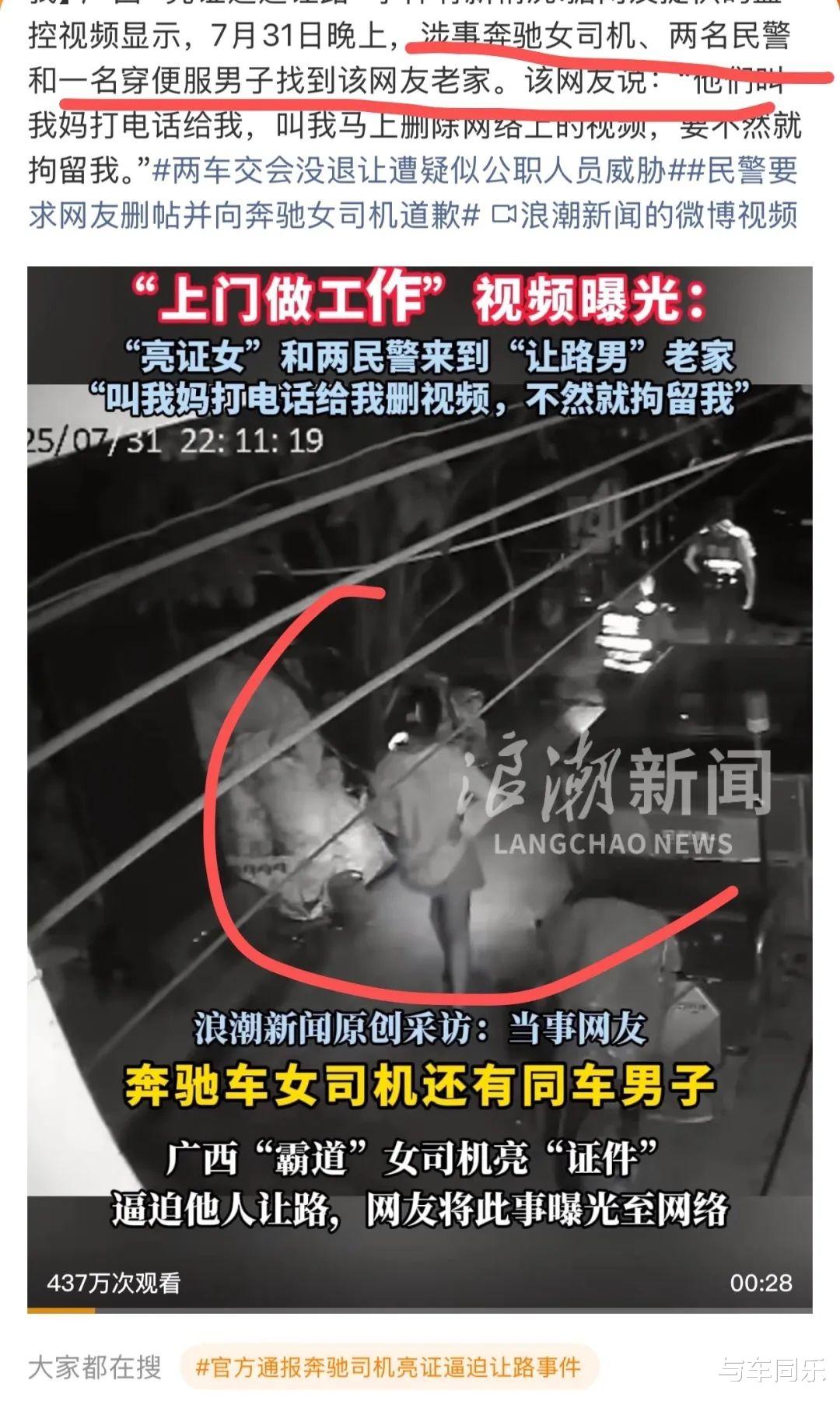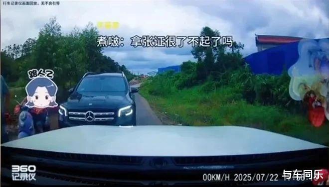 7月22日,“亮证姐”开着奔驰,在窄路上与人会车,对向车已经停下来让她,但她要求人家倒车,而且威胁不倒车就亮证。