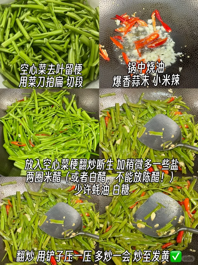 附做法: 1️⃣空心菜去叶留梗,菜刀拍扁,切段; 2️⃣锅中烧油,爆香小米辣,放入空心菜梗翻炒断生 3️⃣加稍微多一点盐,两圈米醋(白醋也可以,陈醋不行!)少许蚝油、糖 4️⃣多翻炒一会,用铲子压一压,炒至发黄✅ -