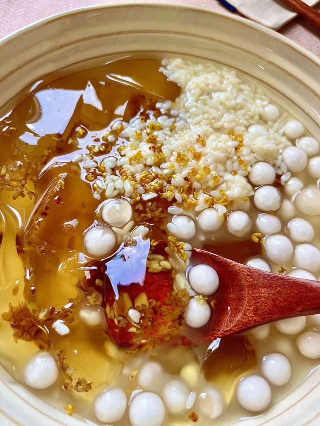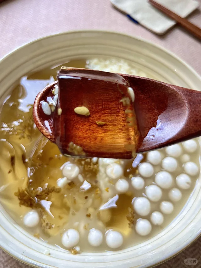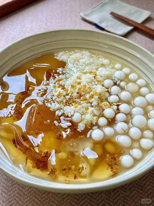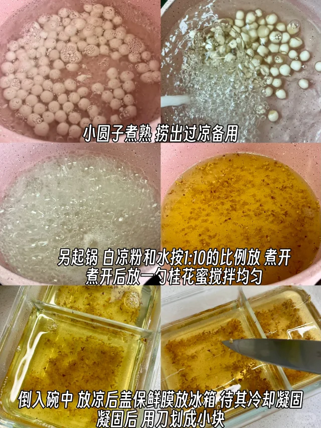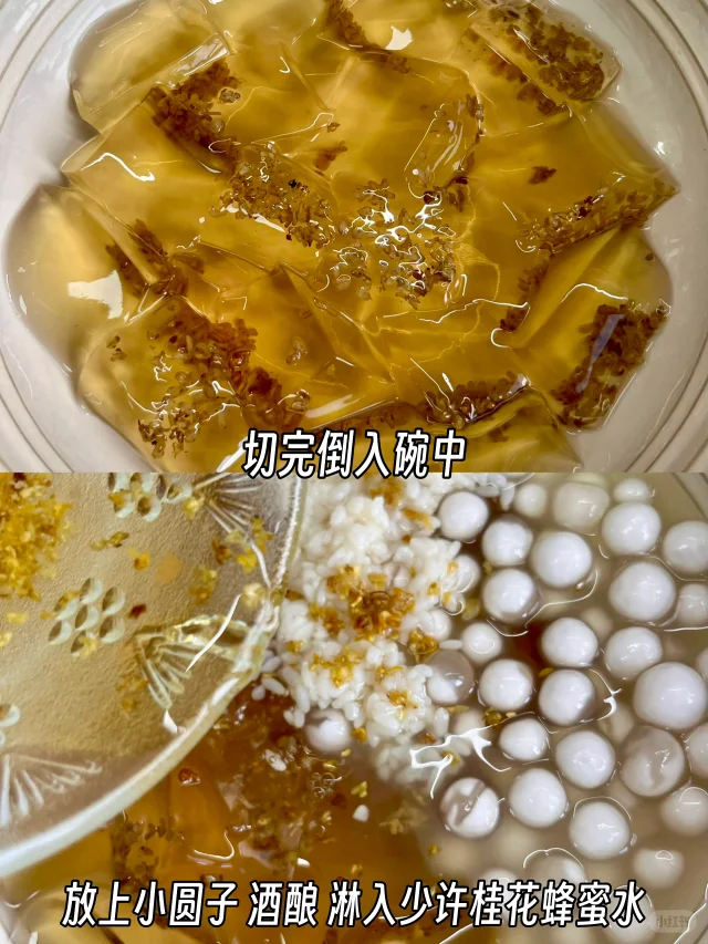 附做法: 1️⃣锅中烧水,小圆子煮熟捞出泡凉水里备用;另起锅白凉粉和水按1:10的比例放入煮开 2️⃣煮开后放一勺桂花蜜搅拌均匀关火,倒入碗中冷凉,凉了后盖保鲜膜放冰箱冷藏一会,待其凝固 3️⃣凝固后用刀划成小块,倒入碗中,放煮好的小圆子,放酒酿,再淋入少许桂花蜂蜜水✅ -