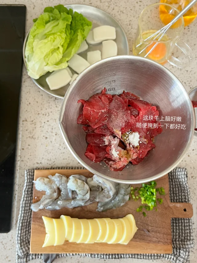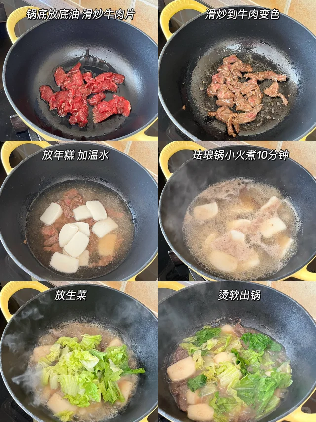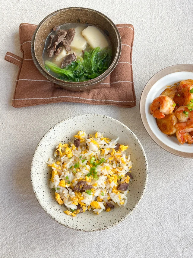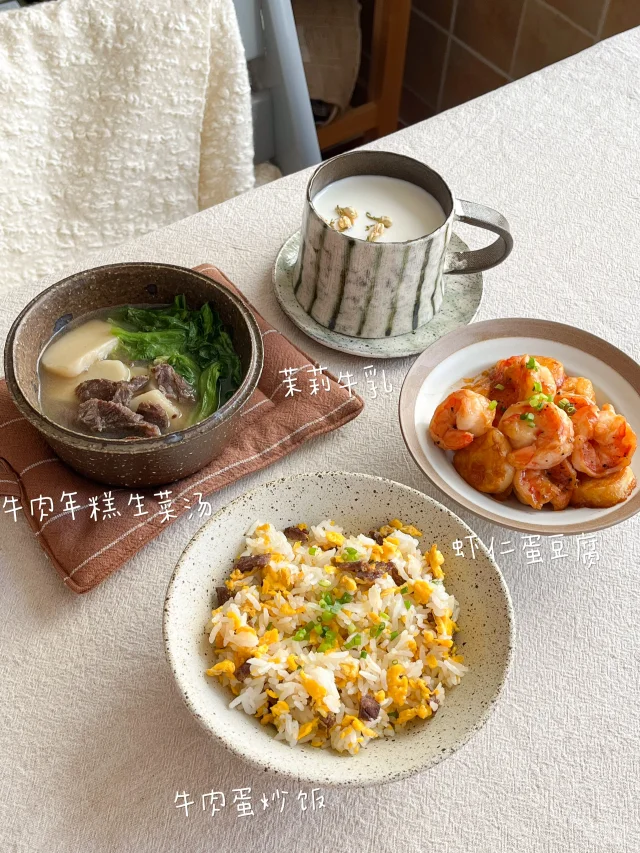 今天的饭: 牛肉蛋炒饭🍳 牛肉年糕生菜汤🥬 虾仁蛋豆腐🍤 茉莉牛乳🌸 糯叽叽的年糕生菜汤🥬 天冷了 那就安排一碗 万物皆可年糕汤 青菜、鸡蛋、肉、年糕 食材自己随意发挥 牛肉提前腌制一下 用上脑或没有筋的部位就OK 年糕煮完糯糯的 罗马生菜很清新 汤也好喝 还可以放白菜 更鲜甜还很耐煮 越咕嘟越好喝 香喷喷的牛肉蛋炒饭🍳 隔夜饭就得用来做蛋炒饭 炒完粒粒分明 一颗蛋 一把葱花 切点牛肉丁 简单又好吃