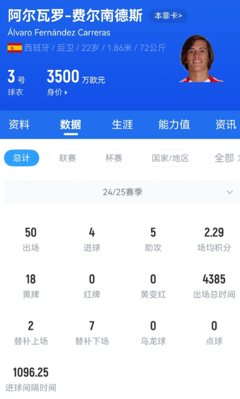 现年22岁的阿尔瓦罗-费尔南德斯-卡雷拉斯,西班牙左后卫,上赛季从曼联以600万欧转会至本菲卡。