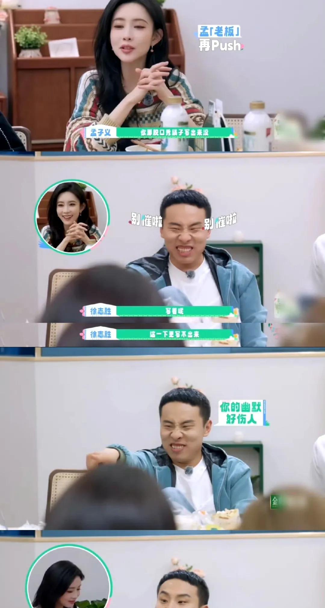 #孟子义一张嘴,徐志胜直接破防!# 谁懂啊!孟子义和徐志胜同框真的笑到打鸣! 桃花坞熟人局又出名场面,孟子义吐槽别人表演不好时,直接放话"当场把串吃了,只把签给他",汪苏泷听完当场拍手叫好。可这话却精准扎到徐志胜——大家笑称"胜子幽默输给孟姐了",徐志胜的脸瞬间垮下来,肉眼可见的不乐呵! 众人你一言我一语调侃下来,徐志胜直接破防:"脱口秀稿子更写不出来了,没自信了!"还急得求孟姐"梗往心里憋憋",简直笑晕!熟人互怼才是最大看点,隔着屏幕都能感受到胜子的委屈,这波快乐必须分享~