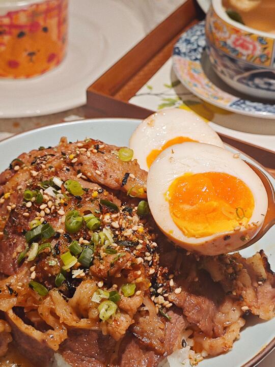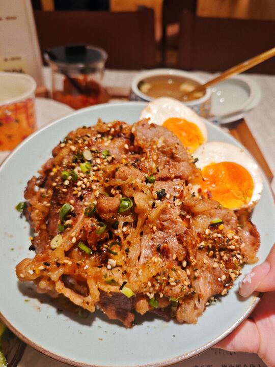 重点夸夸这烧肉!安格斯肥牛肥瘦比例刚好,裹着秘制酱汁香到犯规,撒上芝麻和葱花,咬下去肉汁在嘴里爆开🌿 拌上溏心蛋的流心和米饭,香得想把碗都舔干净!