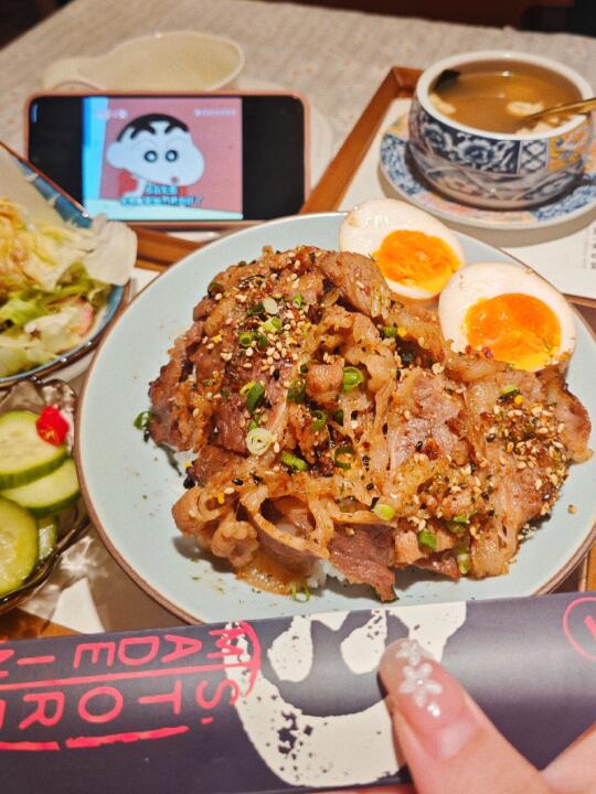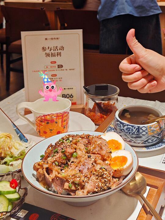 🍱 端上来第一眼就被治愈到!烧肉铺得满满当当,溏心蛋适中🍳 旁边摆着清爽的沙拉、解腻的腌黄瓜,连例汤都用印花小碗装着,配个金色小勺子,瞬间把打工人的午餐仪式感拉满