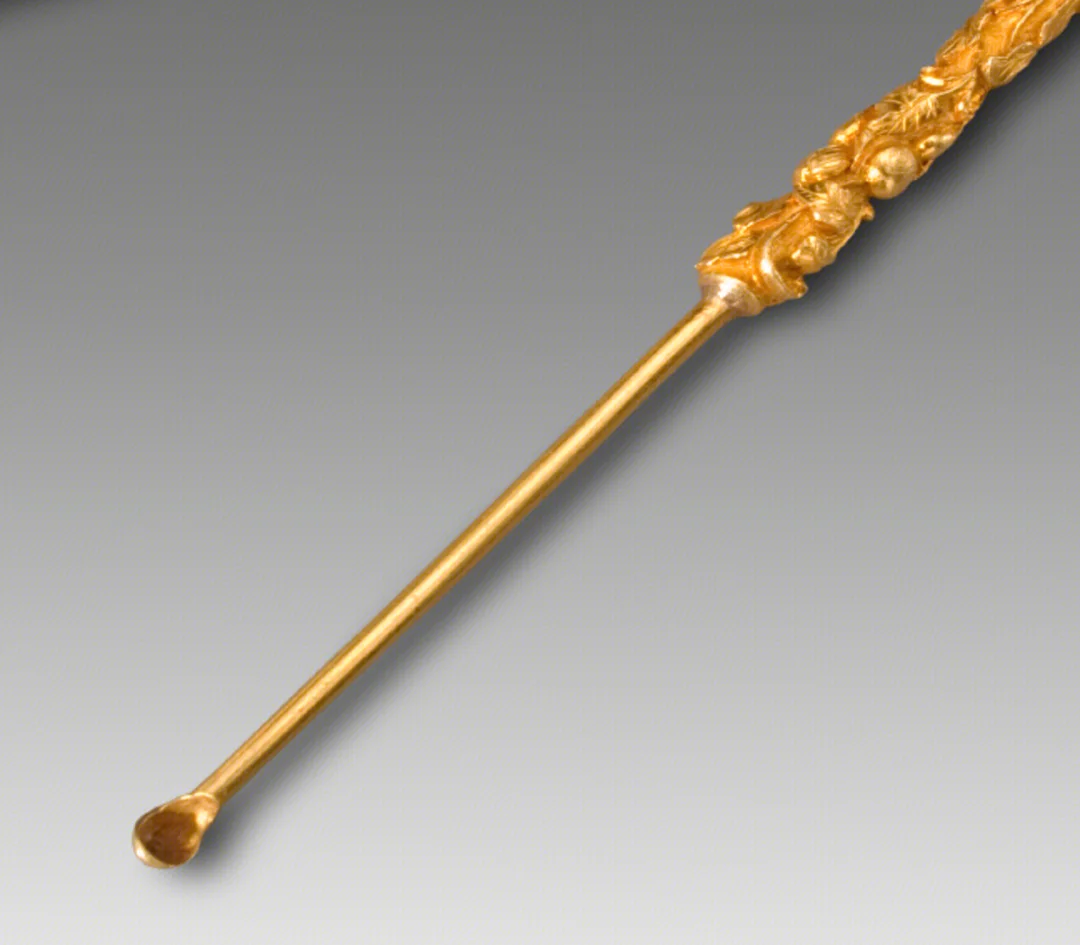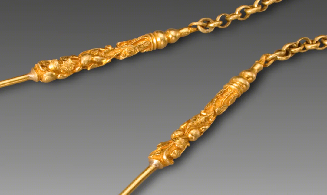 这组金器,将牙签与耳挖功能合二为一,链带相连不易散落。牙签尖细,耳挖圆润,古人精致生活细节,全藏在这小小金具里。