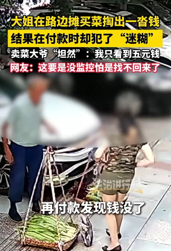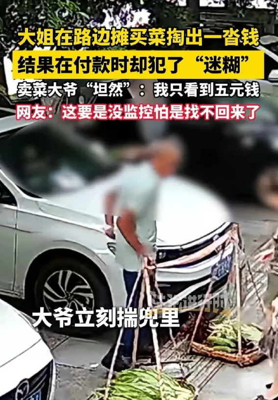 四川,女子为了照顾路边卖菜大爷的生意,买了一把5块钱的菜,付款时一迷糊,竟然给大爷了2000元现金。大爷明知女子付错款,还是赶紧把钱装进兜里。女子又挑了一把菜,付款时发现钱不见了,问大爷有没有看到,大爷还谎称没看到。女子情急之下报警求助,好在当地有监控,民警顺利帮忙找回这2000元。