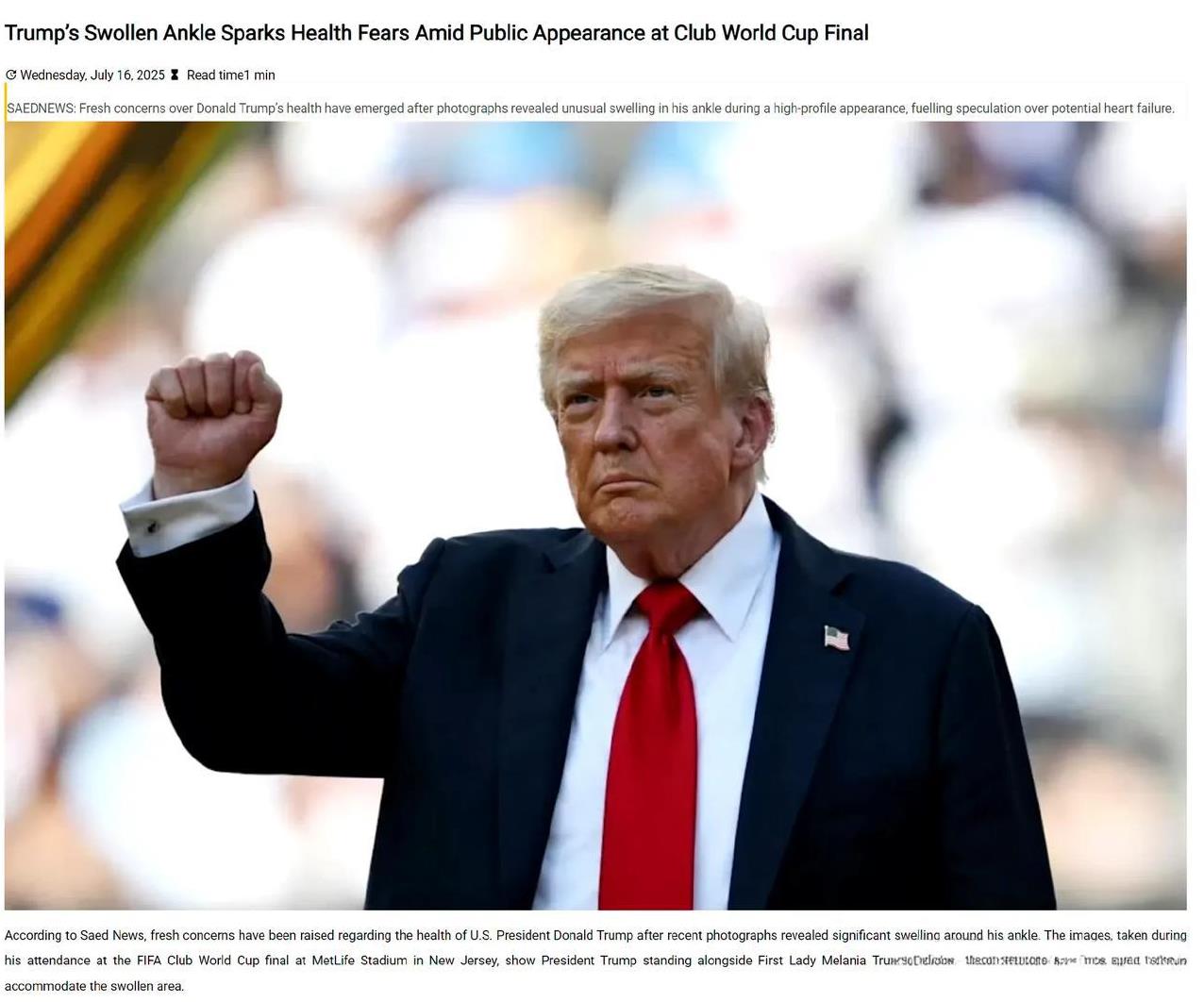 外国媒体说世俱杯的特朗普被拍到脚肿了。就这样还把切尔西的奖牌顺走了?