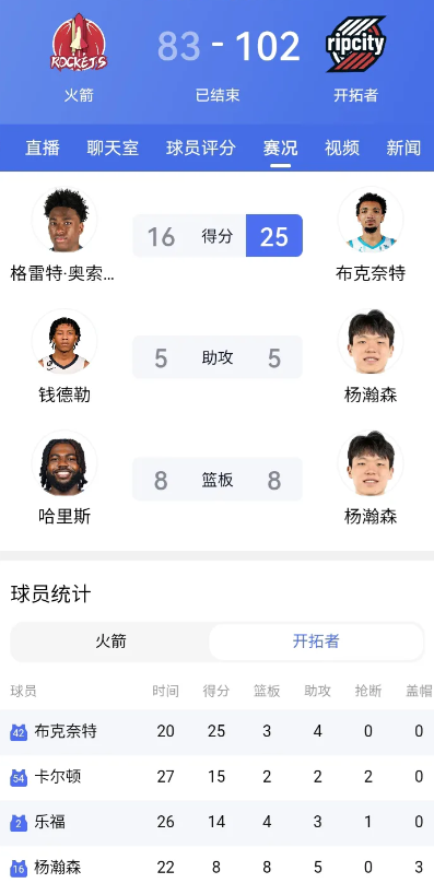 技术统计: 开拓者:杨瀚森8分8板5助3帽、伯克奈特25分3板4助、卡尔顿15分2板2助2断 火箭:奥索博尔16分5板1助2断、凯文-哈里斯14分8板2助2断