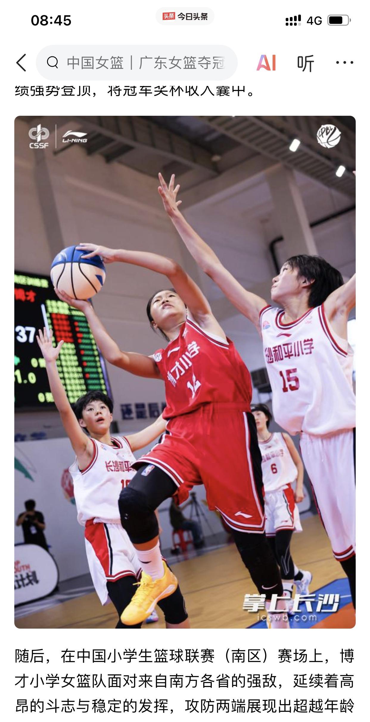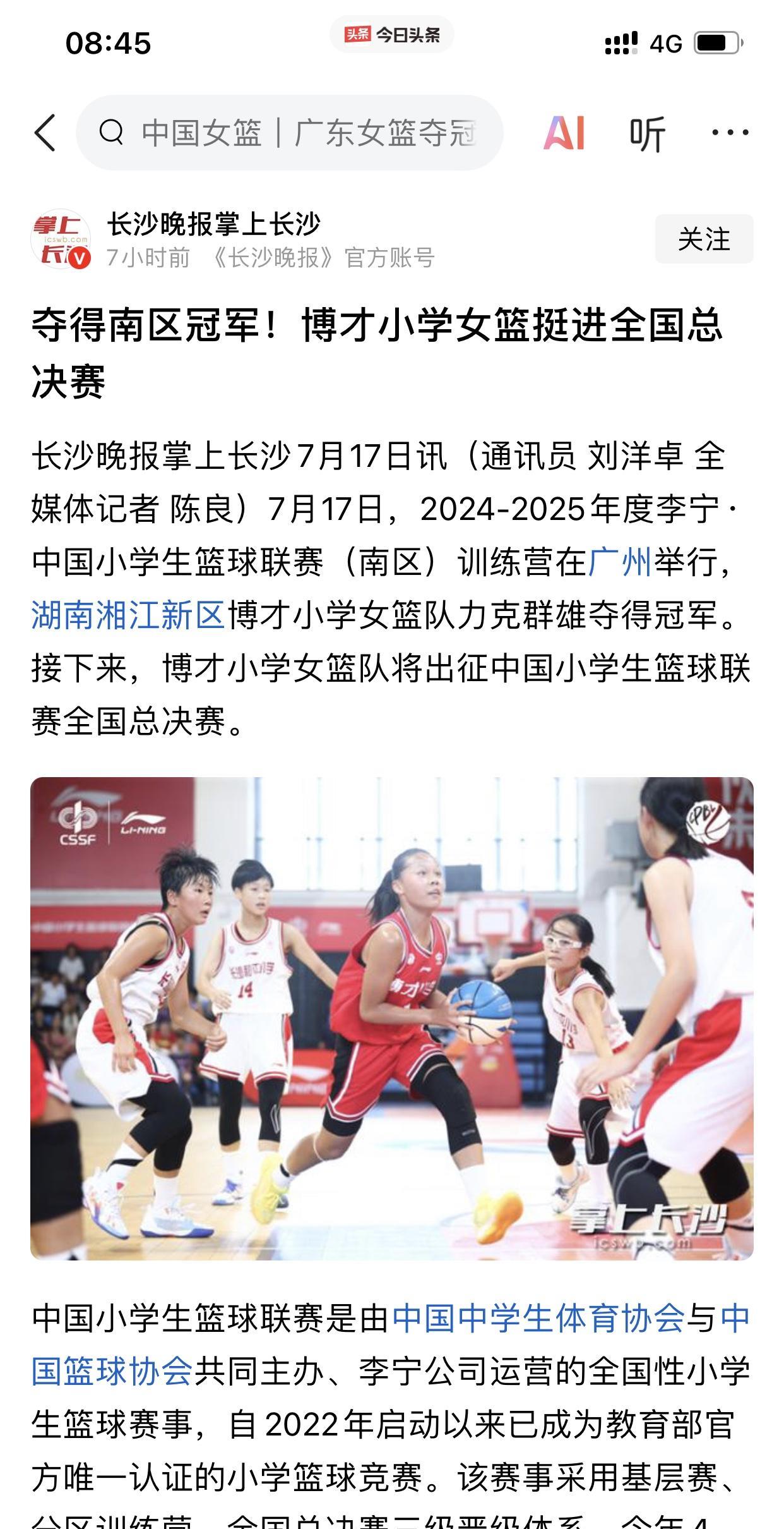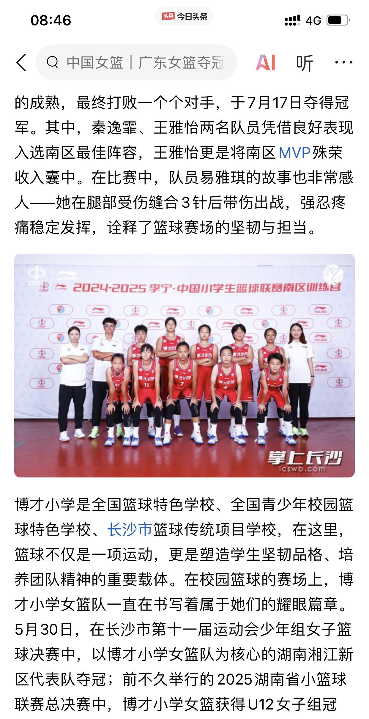 恭喜我湖南女篮的“小孩姐们!”[呲牙] 祝贺我湖南博才小学的女篮队伍在2024-2025年度李宁·中国小学生篮球联赛上,斩获南区冠军,并且获得本年度总决赛资格! 此时此刻,中国国家女子篮球队的大姐姐们正在为中国女篮的荣耀而战! 而我湖南博才小学的孩子们则是为了自己的篮球未来而战! 我相信她们其中一些球员大概率能进入WCBA赛场,甚至可能有一两个能进入国字号队伍! 因为她们小小年纪,却敢于面对挑战,敢于迎难而上! 例如我湖南博才小学女篮的其中一位叫做易雅琪的“小孩姐”,她在本次南区决赛时刻,带着腿部缝合3针的伤病作战,帮助球队夺得这次冠军! 希望她们在本年度的赛事中走到最后,登顶全国总冠军! 加油! 我湖南的博才小学女篮“小孩姐”们!