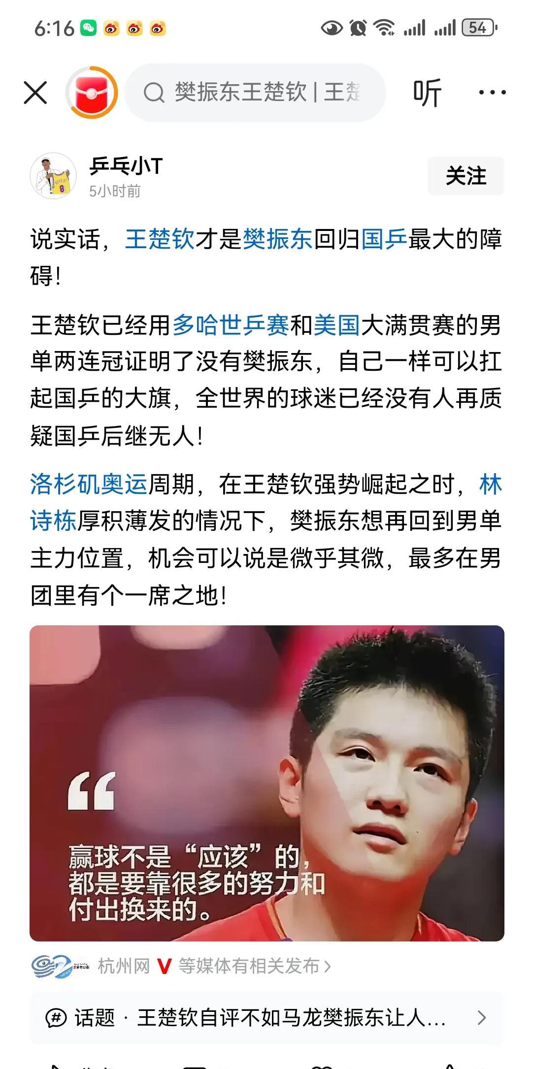王楚钦为什么会成为樊振东回归的障碍?这不是纯粹让王楚钦和樊振东粉丝互撕吗? 国乒什么时候只能有一个主力了,主力多一个,多一个一起扛大旗,国乒对王楚钦都是好事啊,什么时候王楚钦阻碍樊振东回归了? 樊振东回不回归,什么时候回归都是他的选择,他的实力在那里,谁都不是他的障碍。 #分享城市新鲜事#