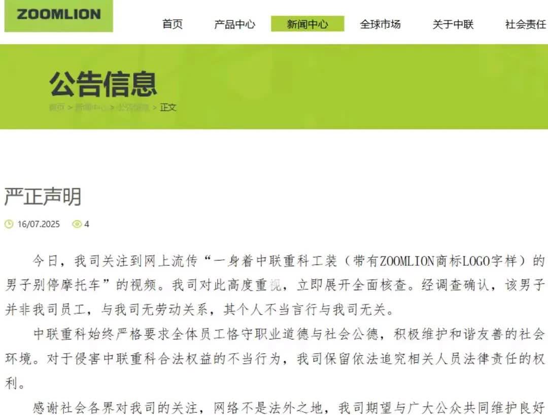 一身穿中联重科工装男子违法别停摩托车的视频在网上火了,只不过火的原因是因为他本来就不占理,下车还威胁对方,要弄死人家!! 随着事件的发酵,中联重科马上撇清关系,说不是他们公司员工!后来被人扒出来,该男子是中联重科的代理商,要不人家能穿这身衣服嘛? 后来一个卖机车的老板,也是发烧友,联系了一下视频的拍摄者,说别车男子已经被拘留了!