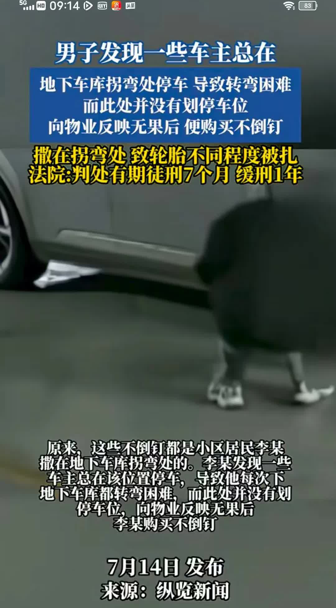 近日,江苏无锡的一名男子,在地下停车场的拐角处撒钉子,导致小区内多名业主的车胎被扎。 小区居民李某长期受地下车库拐弯处乱停车问题困扰,该区域本未规划停车位,却常有车主在此停放车辆,导致李某每次驾车经过都极为不便。李某曾多次向物业反映此问题,但物业并未采取有效措施解决。 令人意想不到的是,李某竟选择了一种极端方式来解决问题。他购买了不倒钉,在十几天内多次将钉子撒在地下车库拐弯处。这一行为导致多位车主的轮胎被扎,给他们带来了经济损失和不便。 最终,李某的行为被警方发现,他也因此受到了法律的制裁。法院认定李某多次故意毁坏财物,构成犯罪,判处他有期徒刑7个月,缓刑1年。 李某的案例给我们敲响了警钟。在生活中,我们难免会遇到各种问题和矛盾,但是我们必须保持冷静和理智,用合法的方式来解决问题。如果我们采取极端的手段,不仅无法解决问题,还会让自己陷入更加麻烦的境地。 同时,这个案例也提醒我们,物业等相关部门应该加强管理,及时解决居民反映的问题,避免类似的事情再次发生。只有大家共同努力,才能营造一个和谐、安全的生活环境。