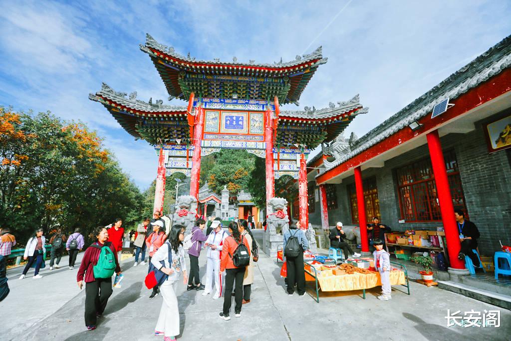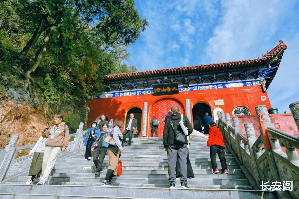 顺着红叶步道往上走,千年大香山寺逐渐清晰,红墙黛瓦被火红叶片簇拥,寺内两株千年古柏挂满金黄枝叶,树龄已超 1300 年,传为唐代高僧玄奘西行归来后亲手栽种。