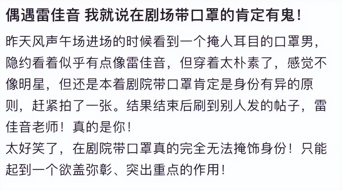 十月十五日,网友在剧场里偶然遇到雷佳音,起初网友没能认出他,原因何在呢?雷佳音此次穿着打扮极为朴素,他戴黑色口罩,还戴蓝色棒球帽,身上穿宽松大短裤,双脚趿拉着拖鞋,看上去与普通路人毫无差别,似乎出门前他没精心打扮自己,站在人群中,几乎没人能认出他 。使人觉得惊喜的是,雷佳音手上戴着一双黑色手套,戴者这双手套利于他去摆弄核桃,呈现出一种极为随性自然的模样!