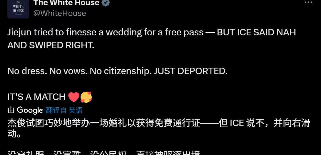 白宫官方无码实名羞辱中国女性,为什么胡锡进、中国妇女报、复旦大学教授不出来发声呢,前几天国内开除有辱国格的女大学生,它们说“封建浸猪笼”、“中国社会塔利班化”“迫害女性”等等…. 白宫为了嘲讽中国,甚至做了动画片取笑这个jun jie zhang的女性,说她骗婚、勒索、要挟美国人和他结婚,外国网友还整理了一些easy girl的合集图,都是一些倒贴外国人的中国女子,在和外国白人黑人发生关系后被拍摄出来传到网上!图5! 有意思的是前几天李时莳因为违反校规和外国人不正当交往,被大连工业大学开除,国内有些人像被踩了尾巴,胡锡进、复旦大学教授、中国妇女报和一些女钱等等跳出来指责学校,说这是“封建浸猪笼”、迫害女性、中国社会塔利班化…. 但是现在白宫这样它们就不敢说什么了,白宫可是实名的大头照直接无码在多个官方账号去公布这个中国女性的信息,甚至做了动画来嘲讽! 其实对于这种骗婚的,中国人大部分都感到气愤,白宫这种做法其实普通人反而是支持的,毕竟很多人深受其害,反而是以前美国利用性别对立搞乱中国那一套人人忌惮,你看现在就有那么多人为李xx说话,抨击大连工业大学!对美国却不敢出声……ps大连工业大学以前还有一个著名的女性“兽兽”,所以为什么这个学校校规有这一条,因为吃过亏了