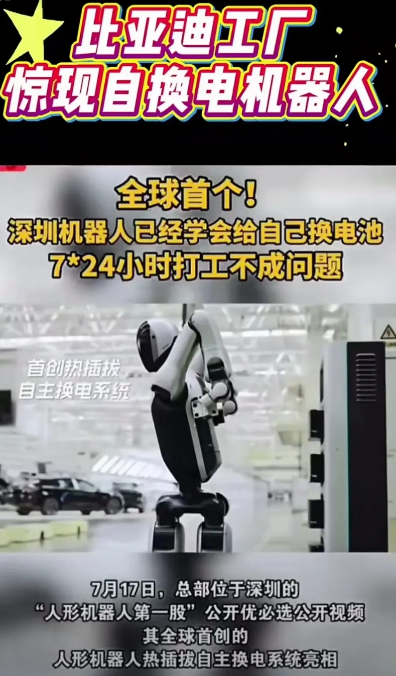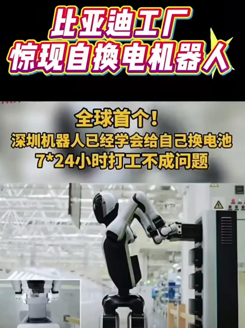 新时代的“包身工”,比亚迪工厂惊现全球首个自换电机器人。 这包身工比旧时代的厉害多了,不用睡觉,只要你肯交电费能给活干,7*24小时都在替你挣钱任劳任怨。老王每天睡醒觉,机器人已经把白花花的银子给他挣回来了,想想都觉得美! 谁说比亚迪只是造车来着?各位尬吹的具身机器人还在ppt上,迪子家的已经在生产线上替各位造新能源车了。 巧的很,几天前新晋全球首富老黄刚说过:如果哪天比亚迪突然展示出先进的具身机器人,大家一点都不要觉得奇怪,因为它有这个能力。