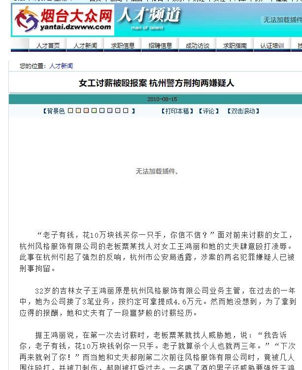 杭州一女子和丈夫向老板讨薪未果,反被公司叫人打成重伤,老板更是叫嚣,要花10万元买她的一只手,女子:我真是想不通,本来就几万块钱的事,非要搞成这样!这到底怎么回事? 杭州一女子和丈夫只是想讨回几万块工资,却被老板叫人打成重伤,老板还嚣张地说要花10万买她一只手!这事听着就让人冒火,几万块钱的事咋就闹成这样?背后到底藏着啥猫腻?真相让人瞠目结舌,快来看看这起事件的来龙去脉,劳动者的血泪教训值得每个人深思! 这事发生在2009年的杭州,主角是32岁的王鸿丽和她丈夫郝刚。两人都是普通打工人,王鸿丽在一家叫杭州风格服饰的公司做销售,干得挺出色,2009年10月一个月就签了300多万的大单,按公司提成协议,她该拿4.6万工资。这钱对他们小两口来说不是小数目,能还债、改善生活,甚至攒着买个小房子。可谁想到,这笔工资却成了噩梦的起点。 王鸿丽去公司找老板粟志宏要钱,结果老板不仅不给,还污蔑她泄露公司机密,威胁说有钱买她一只手。她不服气,第二天带丈夫再去讨说法,没想到直接被老板叫来的几个人暴打。郝刚被打得脑震荡昏迷,王鸿丽脾部被刀刺伤,差点没命。事后她从口袋掏出一支录音笔,把整个过程录了下来,成了关键证据。这事一曝光,社会哗然,老板粟志宏最终被抓,判了10年,几个帮凶也分别判了5到8年。 这案子听着就气人,但仔细想想,问题没那么简单。王鸿丽本来就是个勤快人,从吉林农村走出来,上过大学,在杭州打拼多年,好不容易干出点成绩,却因为几万块工资差点丢了命。老板粟志宏也不是啥好鸟,仗着自己有点钱,觉得可以随便欺负人,还敢在光天化日下动手。这种人渣被判刑是大快人心,可王鸿丽两口子受的罪谁来赔?这事暴露了劳动者讨薪有多难,也让人忍不住问:为啥好好要个工资能搞成这样? 从这事看,劳动者权益保障真是个大问题。在中国,像王鸿丽这样被欠薪的打工人不少,有些老板就是拖着不给,觉得你没辙。法律上,《劳动法》《劳动合同法》都写得清楚,工资不能随便扣,可现实里执行起来咋就那么难?王鸿丽有录音证据还算幸运,要没这东西,估计就得吃哑巴亏。法律是死的,执行靠人,劳动监察部门得多使劲,查查那些欠薪的老板,别老等着劳动者自己去拼命维权。 再说社会舆论,这案子能闹大,媒体和公众功不可没。报道一出来,大家都看不下去,纷纷声援王鸿丽,官方也坐不住了,杭州市委书记直接批示严惩。这种关注是好事,能逼着法律动起来。可光靠舆论也不行,平时没出事的时候,谁去关心那些被欠薪的普通人?社会得有个长效机制,不能总等出了大事才喊两声。 企业这边也得反思。粟志宏这种老板就是反面教材,欠薪不说,还敢打人,完全不把劳动者当回事。正常企业就该按时发工资,别老想着克扣、拖欠。说白了,员工赚了钱给你,你凭啥不给人家应得的?现在好多公司有劳动争议调解机制,但像粟志宏这种压根不讲理的,调解有个屁用。企业得有点底线,不然迟早把自己作死。 劳动者自己也得长点心。王鸿丽这次是拼了命才拿回工资,一般人哪敢这么干?遇到欠薪,第一时间找劳动监察部门,或者报警、走法律途径,总比自己硬扛强。别怕麻烦,钱是你辛苦赚的,凭啥不要?提高点维权意识,学着用法律保护自己,别老觉得“算了算了”。 这事最后算是有个结果,粟志宏被判刑,王鸿丽拿回了4.6万工资和10多万赔偿,劳动监察部门还因此加了把劲,设了举报热线,多查了些欠薪企业。王鸿丽两口子后来回吉林开了个小店,日子平稳了点。可这代价也太大了,身体上的伤、心里的阴影,谁能还给他们?这案子不只是个案,是个警钟,提醒大家劳动者权益不能光喊口号,得实打实干点事。 劳动者权益这事,说到底是个系统活儿。政府得管好法律执行,别让法规成摆设;企业得守规矩,别把员工当奴隶;社会得盯着点,别等出了人命才关注;劳动者自己也得硬气点,别老忍气吞声。经济发展的确重要,可发展不能靠压榨劳动者吧?谁不想干活拿钱过日子,偏偏有些人要把这简单的事搞复杂。 想想王鸿丽那句话:“本来就几万块钱的事,非要搞成这样!”多无奈又多真实。这社会要是能让劳动者安心拿工资,不用提心吊胆,不用拼死拼活,那得多好。现实是,离这目标还远着呢,得靠大家一起使劲。 这事太离谱了,几万块工资硬是搞出人命官司,劳动者咋就这么难?法律能不能再给力点?老板们能不能别这么嚣张?欢迎大家留言说说看法,有没有遇到过欠薪的事,咋解决的?一块儿聊聊,帮劳动者撑撑腰!