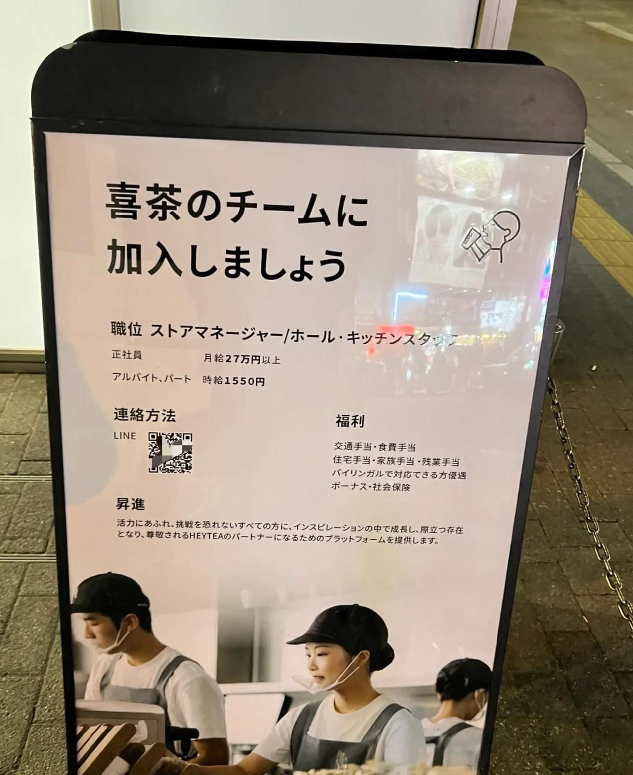 喜茶在河南:时薪9元人民币 喜茶在大阪:时薪75元人民币(1550円) 喜茶