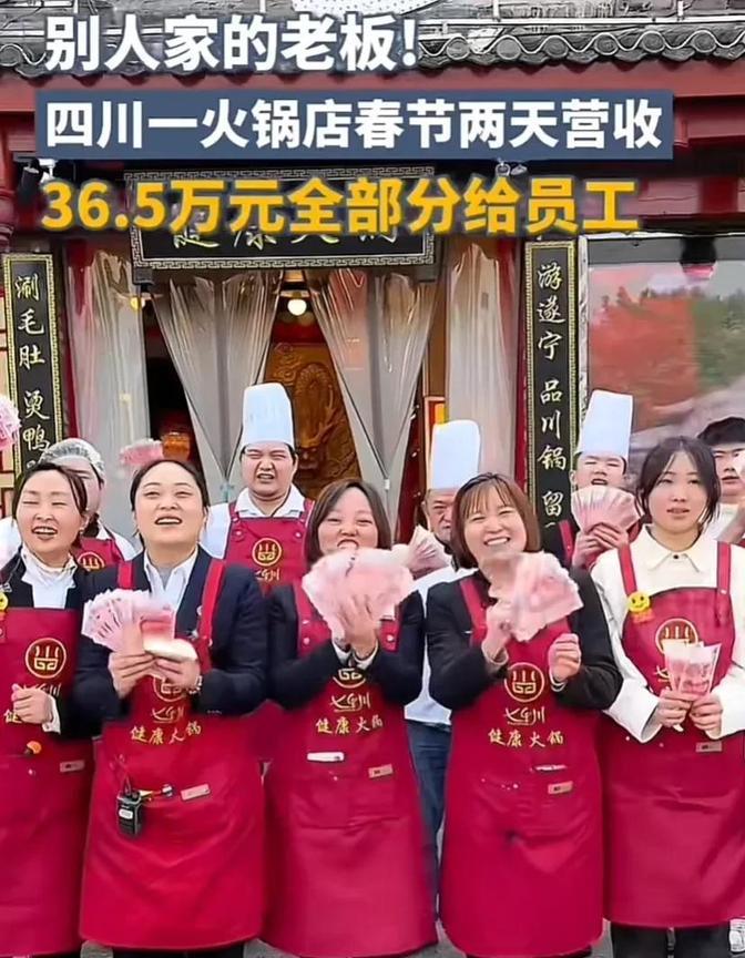 这老板火了!四川遂宁,一火锅店老板把春节两天营业收入,36.5万元全部分给员工,
