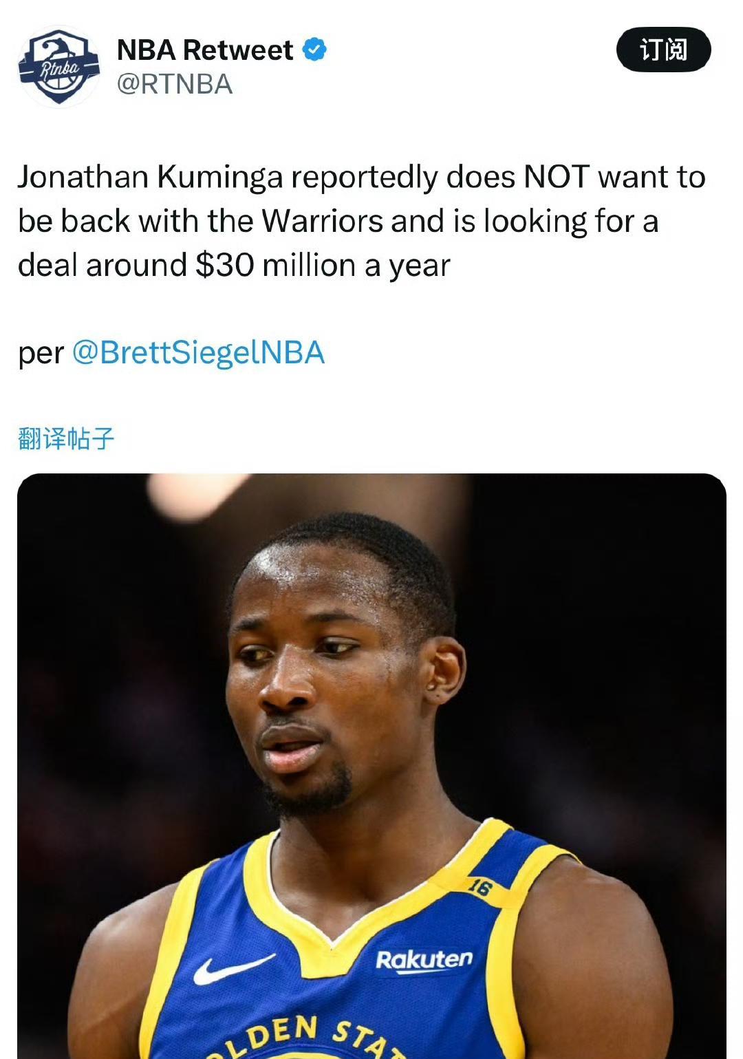 和勇士决裂!!!库明加希望拿到3000万并先签后换离开勇士! 库明加现在是不离开