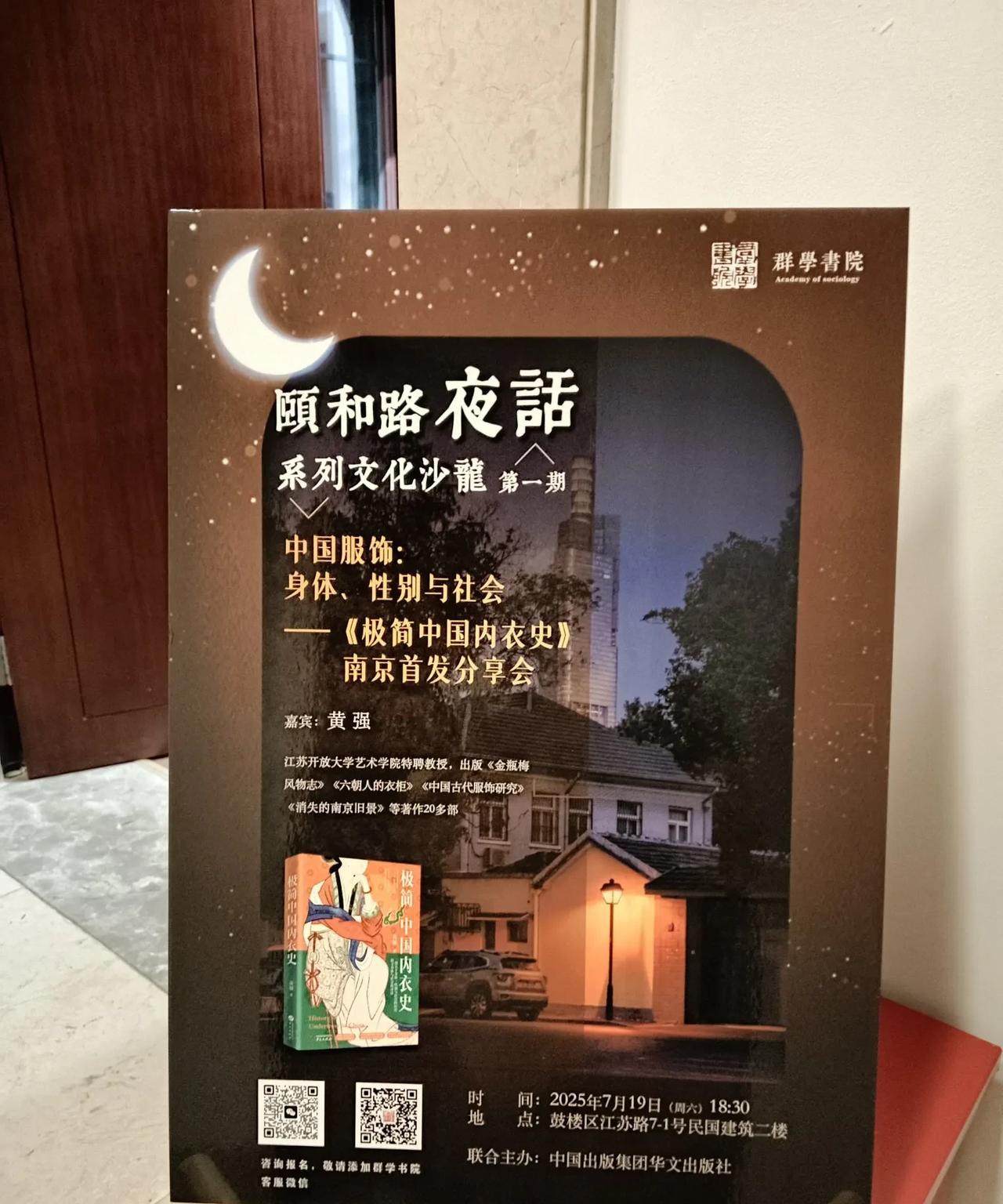 颐和路夜话第一期,7月19日晚在江苏路7-1号民国建筑里如期举行,圆满结束。黄强教授《服饰、身体、性别与社会》讲座,讲述鲜为人知的古代内衣历史及其流变,服饰与社会的关系,内衣与人体的关联。座无虚席,有听讲者专程从无锡赶来,听完坐夜车回无锡。群学书院准备的二十多册《极简中国内衣史》也都签售告罄。