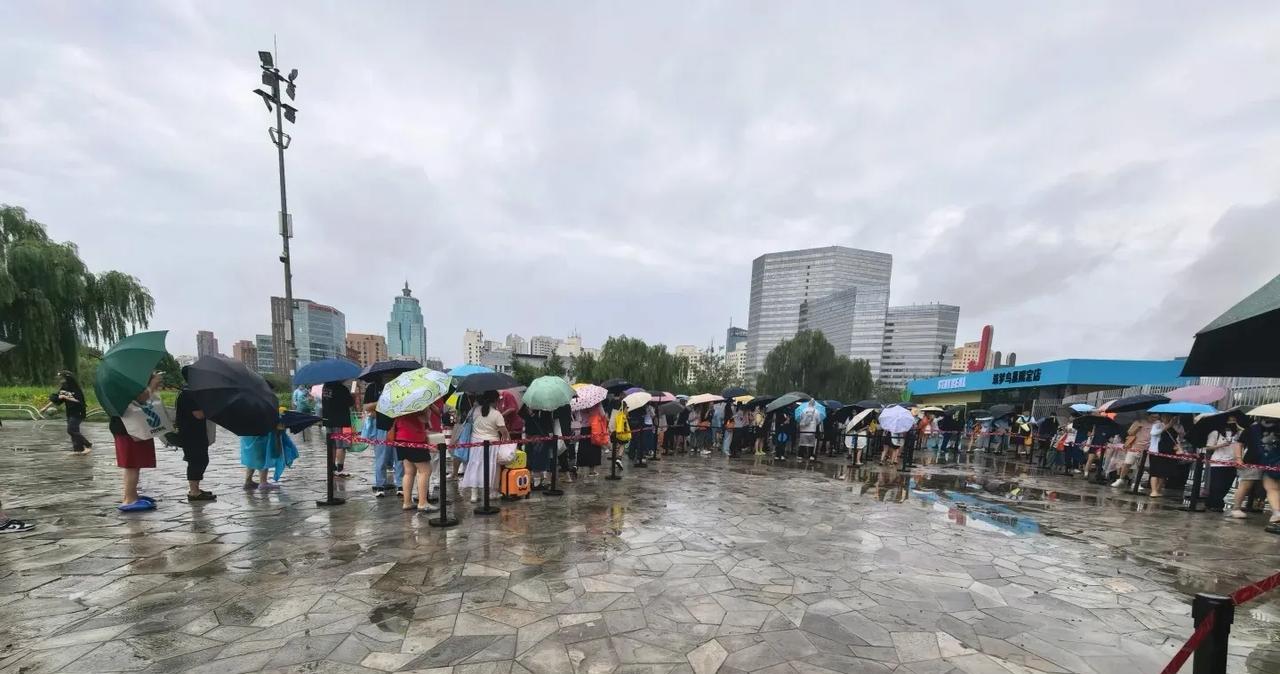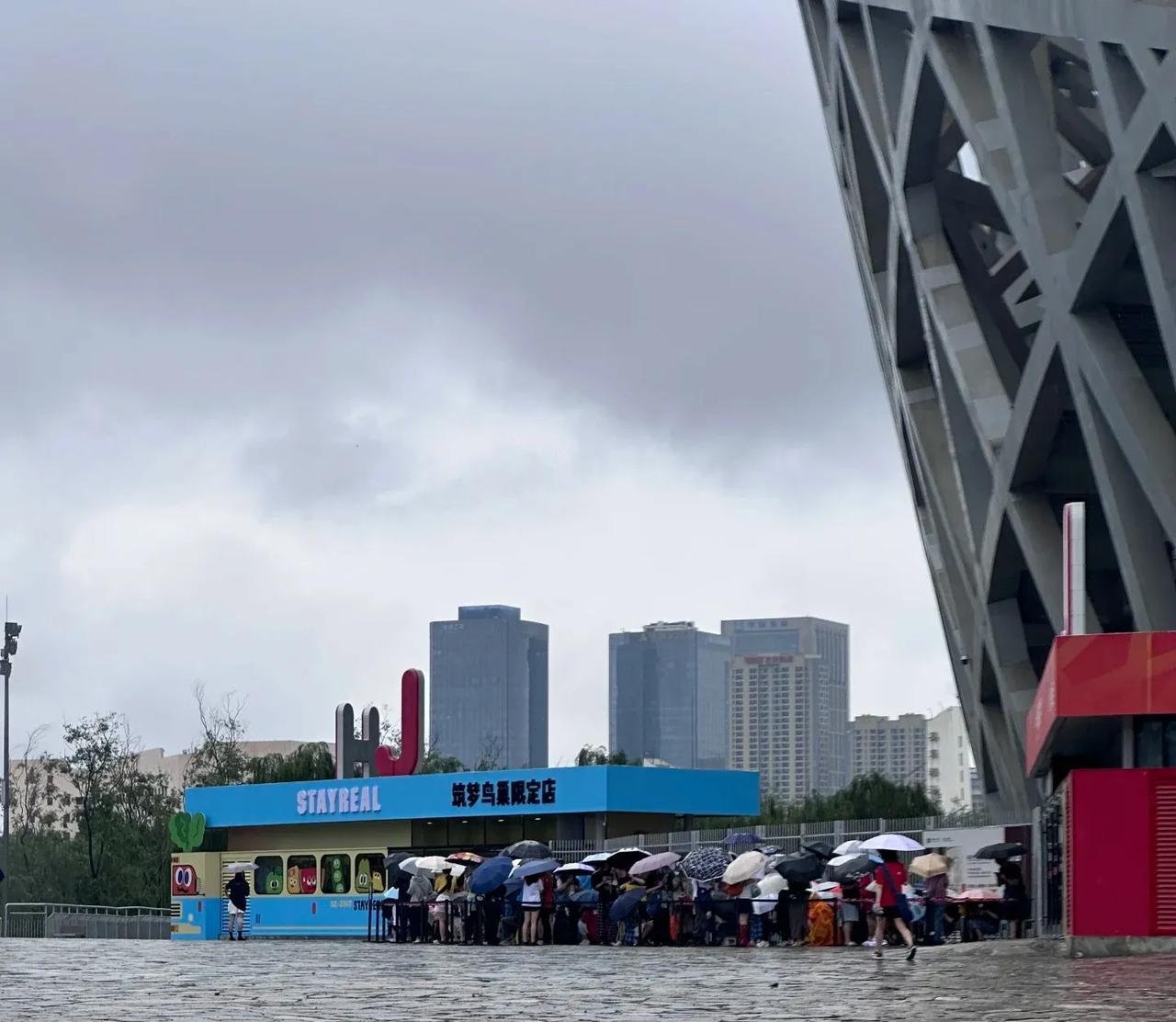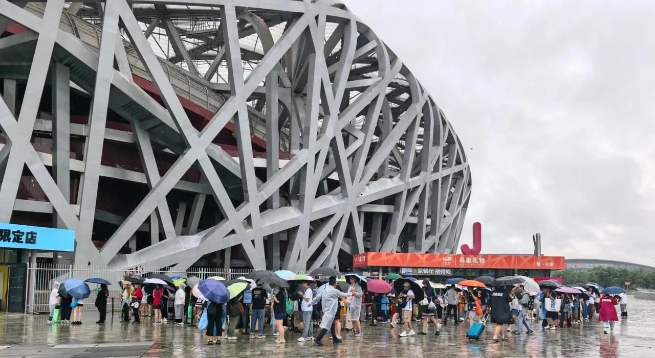 上午,雨一直下,鸟巢外还是排了几百人!很多人是排了一轮又一轮!