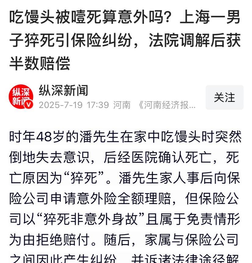 上海,男子在家中吃馒头,可吃着吃着,他竟突然倒地,噎死了。家属火化完遗体后,想起曾给男子买过意外险,理赔金 10 万,可保险公司的理赔专员李姐当时就摇头,说这不算意外,还指着合同里的字说噎死在免责范围里,家属一听就急了。 潘先生的爱人刘女士后来跟我们念叨,这事发生在 2023 年 11 月 12 号,就在上海浦东的那个老小区里,那天她刚好回娘家,就剩公公潘先生和婆婆张阿姨在家。 张阿姨现在一提还抹眼泪,说那天蒸的是白面馒头,有点硬,老头子吃快了,嘴里还嚼着就说 “噎、噎”,手往脖子上抓,接着就直挺挺倒地上了,脸憋得通红。 邻居王大哥说他听见张阿姨哭喊,赶紧跑过去,看见潘先生躺在地上没动静,张阿姨手抖得拨不对 120 号码,还是他接过手机打的,救护车到的时候是 11 点 40 分,医生看了看就说不行了。 急救记录上写着 “口腔内见未咽下馒头块”,死亡证明写的是 “猝死”,张阿姨说当时脑子乱,就想着赶紧让老头子入土为安,火化是 11 月 15 号办的,过了一周整理抽屉才看见那份 2016 年买的意外险保单。 刘女士拿着保单去找保险公司,李姐翻了翻记录说,这保单是保意外身故,可猝死不算,而且潘先生 2021 年体检有高血压、心脏早搏,属于有潜在疾病,符合免责条款。 “我们哪知道猝死不算意外啊?” 刘女士提高了声音,说买保险的时候业务员就说 “出啥事都赔”,根本没提这些,她还去找当时的业务员,对方早就离职了,公司说换了好几波人,查不到记录。 小区物业调了监控,11 月 12 号上午 11 点 25 分,潘先生确实是自己走进厨房拿馒头的,没跟人争执,也没摔倒磕碰,王大哥说 “就是吃馒头出的事,这还不算意外?” 张阿姨去居委会找李主任评理,李主任说 “我也不懂保险条款啊,要不你们找街道司法所问问?” 街道司法所的小赵解释,保险法里有说,要是没及时通知保险公司,导致死因说不清,保险公司可能不赔,“你们火化了才报案,确实有点麻烦”。 双方闹到法院,开庭那天,保险公司拿出去年的体检报告,说潘先生的身体状况本来就不好,噎死可能是疾病诱发的,刘女士就哭,说 “他平时一顿能吃三个馒头,身体好着呢”,还请了邻居作证。 法官说要不调解试试,调了两次没成,第三次李姐带来个领导,说 “最多再加 2.8 万,之前已经给了 2 万通融款,总共 5 万,再多真不行了”,刘女士跟张阿姨商量了半天,点头了,“折腾不起了,就这样吧”。 本文信息综合自本地媒体公开报道(2025 年 7 月 18 日)