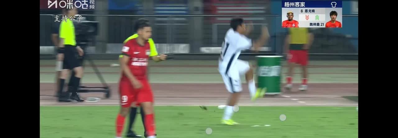 河南队黄锐锋蹬踏梅州客家当家射手恩戈姆,当值主裁判在观看VAR后,直接出示红牌,