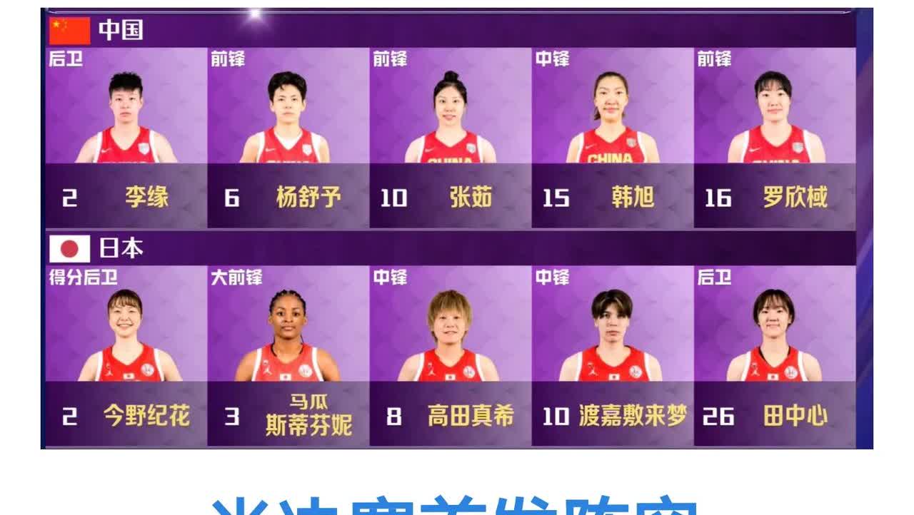 【不敌日本队,中国女篮无缘决赛】2025年7月19日晚上七点半,女篮亚洲杯半决赛,中国女篮对阵日本队,首发名单如右图,身高2.26米的张子宇并没有首发,日本队上半场一开始就8-2领先,中国队没有慌乱努力追赶,没过多久张子宇终于上场了,比分很快就扭转到20-14领先了,这时张子宇下场休息,日本队想借此机会追分,26号田中心发挥非常出色,日本队追到24-24平了,首节比赛结束时比分27-27平。 第二节比赛开始了,双方的争夺更加激烈,中国队一度落后8分,好在最后时刻张子宇表现出色连续得分,最后中国队51-49领先2分结束了上半场。 下半场的比赛依然很胶着,田中心继续稳定发挥,攻防转换都很快,日本队58-56领先了,这时张子宇再次上场,日本队加强了有针对性的防守,8号高田真希一直对张子宇贴身防守,使得张子宇很难投篮,渐渐的日本队66-57领先了。最后1分钟时中国队63-71落后,她们非常积极进攻,不过最后还是65-73落后8分结束了第三节。 第四节一开始中国队就派出了张子宇和韩旭组成的双塔组合,效果立竿见影连续追分,日本队利用三分球82-76保持领先,最后五分钟时双方体能都在下降,也都在坚持,中国队78-84落后时叫了暂停,继续比赛后中国队失误增多,日本队88-78领先了,最后中国队81-90惜败日本队无缘决赛,实在太遗憾了!
