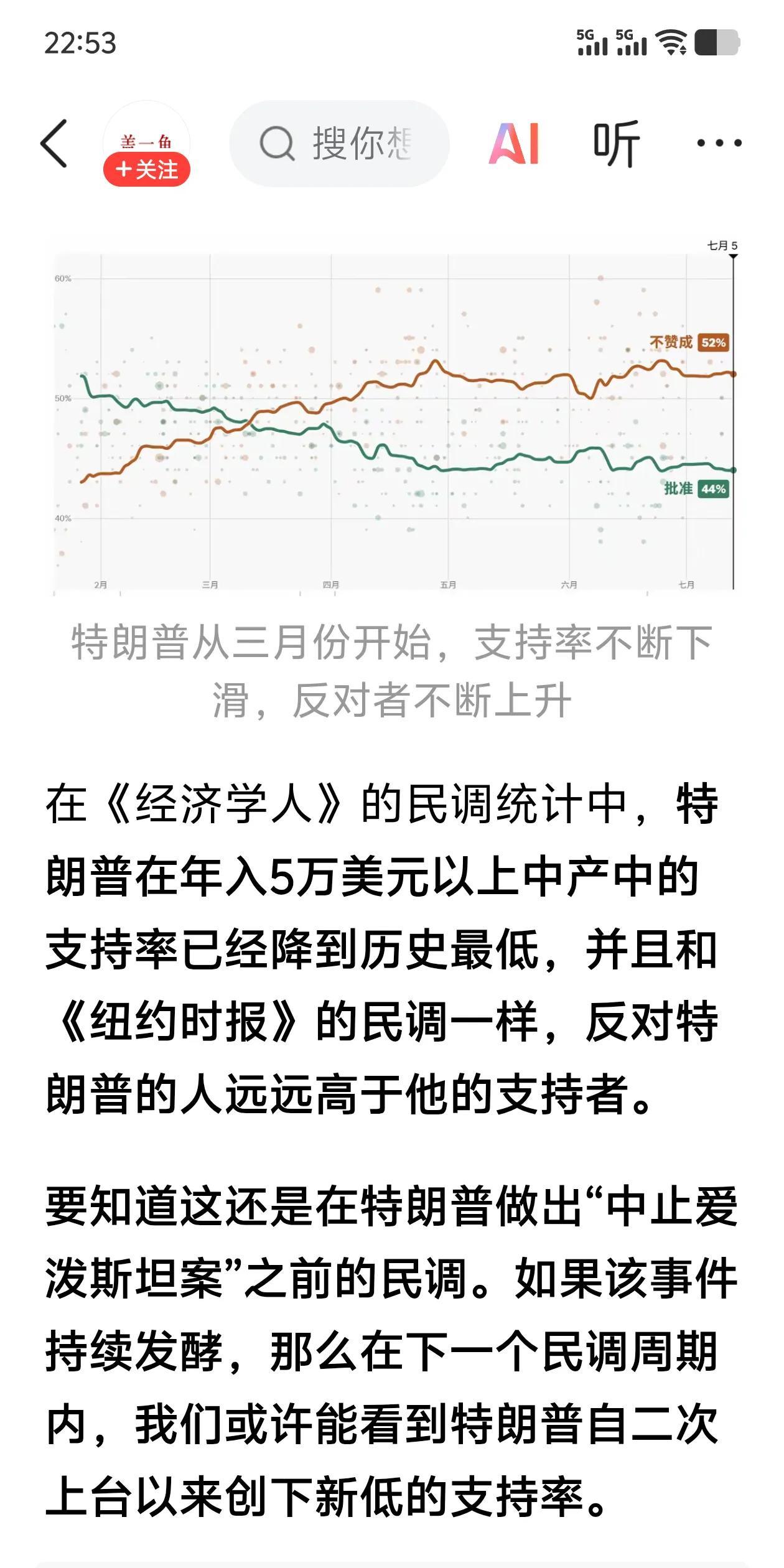 特朗普越来越活在自己的世界里,认为近期爱泼斯坦事件风波后,他的民调越来越高——目前没有任何一个民调显示特朗普拥有90%以上的支持率,我之前的文章就说了,在爱泼斯坦(近期的)事件前夕,特朗普支持率已经不断下滑,预计本月初或下个月新出炉的权威民调能看见特朗普的支持率或将创下近三十年来美国总统的新低。