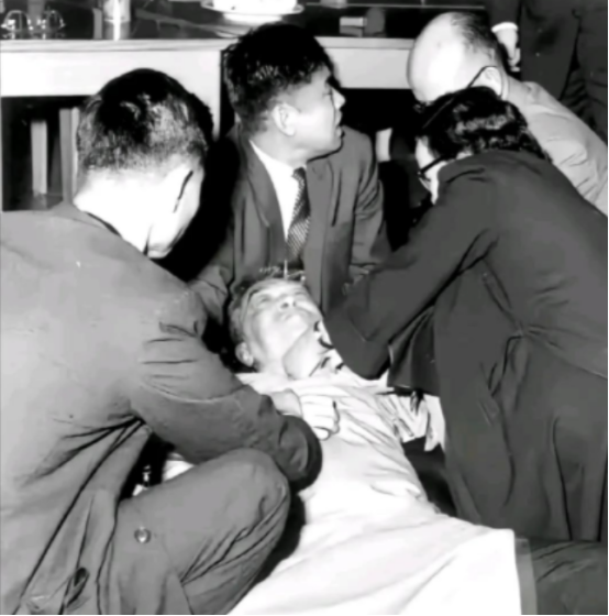 这是胡适被“气死”的场面,当时胡适正参加晚宴,他首先致辞后,学者李济说了一番话后,紧接着胡适就心脏病突发倒地身亡,现场乱作一团,记者连忙拍下了这一幕。