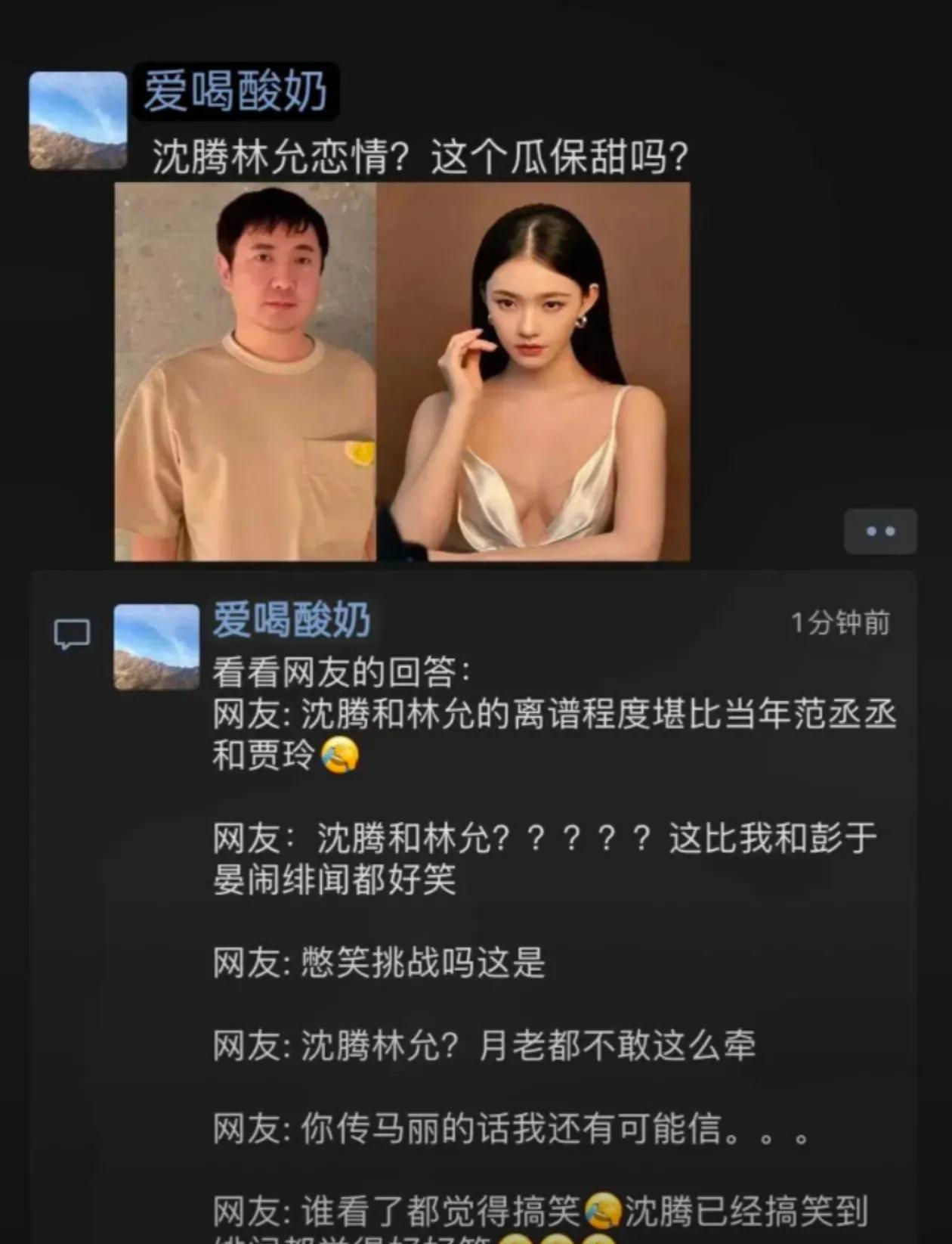 离谱!沈腾和林允被博主拍到先后现身某公园 无巧不成书!没想到7月份有博主拍到沈腾和林允现身某公园的照片。两人时隔一天先后出现,怎么会有这么巧的事情?虽然没有拍到他俩的合影,但是这也太让人不可思议了吧?前几年同样也拍到两人的名场面:在三亚旅游,都是一前一后,也是没有拍到在一起的画面。后来沈腾和林允都出来辟谣了,说两人根本都没有什么,不要乱造黄谣了。其实仔细想想,沈腾为人憨厚老实,林允特别清纯玉女,感觉他俩也不可能在一块吧,只是正巧出现在同一个地方。有时候世界就是这么小,你说呢?