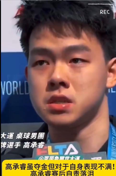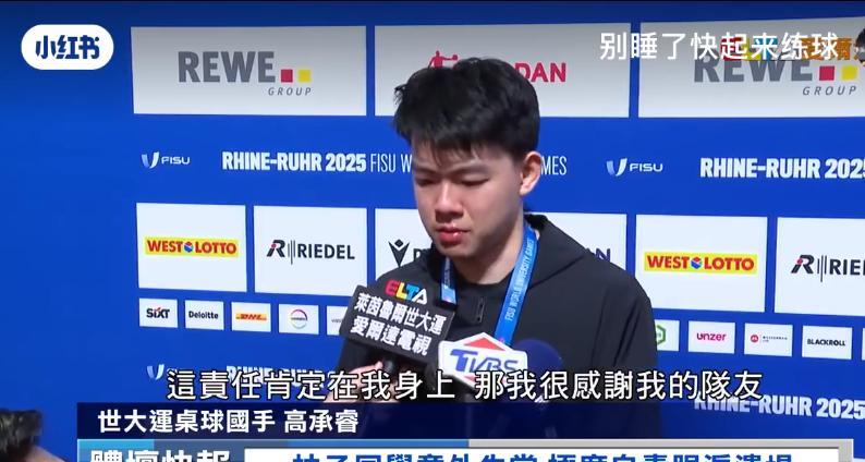 高承睿赛后自责落泪,哭的好伤心。 中国台北队获得2025年大 运会德国乒乓球男团冠军的赛后采访,高承睿因为一个人丢了2分而自责落泪,但是有队友在,中国台北队是3-2战胜了中国队,夺得男团冠军。看了采访,小高是真哭了,看得出来这孩子很有责任心,他说自己毕竟今天的表现可能连铜牌都不如,但谢谢队友们。这就是团体赛的魅力所在,虽然你丢分了,但是有队友扛起来了。 在半决赛对日本队的时候高承睿一人砍两分诶,没有他的话台北队走不到决赛。小高真的挺棒了,决赛状态不好,但是队友顶上了,拿了金牌,恭喜中国台北队。高承睿也是打完美国大满贯赛,就赶到德国去参加这个比赛,去了还要倒时差,但是一路打进决赛拿到金牌,真的很厉害了。 团体赛的魅力就是这样“你输了的时候我顶上,我不行的时候还有你”,一个人可以走的很快,但是一群人才能走的更远。看到有网友说:“起码他们结果是好的,还有自责的机会,这要是输了那就是心里一道坎。”下一个赛场,小高继续加油,这孩子很有拼劲儿的。