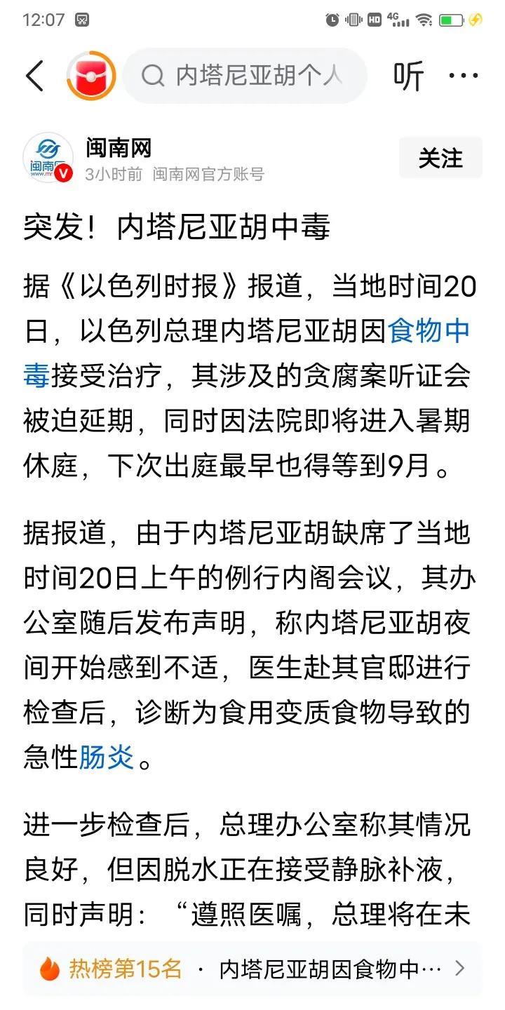 熟悉的味道,熟悉的套路,屡试不爽。 以色列总理内塔尼亚胡突发食物中毒,贪腐案听证
