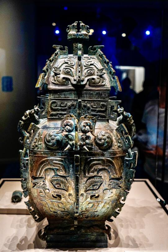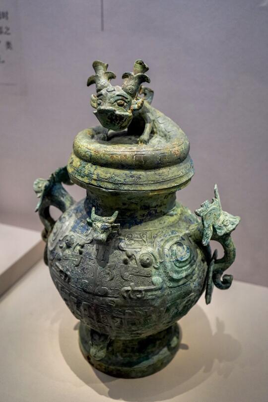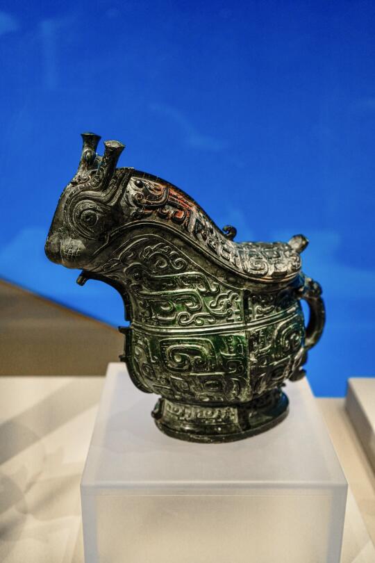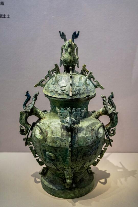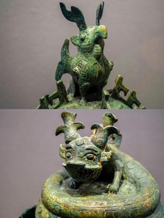 此觥分盖,可以打开,全身装饰有大兽面纹和龙纹