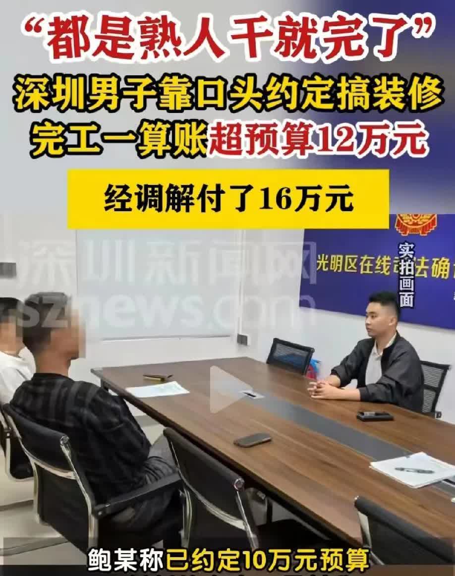 [浮云]4月7日,广东深圳,男子有套300平的房子,委托给熟人装修,因为两人是朋友,开工前并没有商量预算,也没有签合同,给了9万元便直接开干。期间,所有装修事宜全都由熟人负责,男子并未过问,谁知,等房子装修好,熟人拿着预算单找男子结账时,他瞬间傻眼,实际费用竟然高达22万,远远超出他的预期。男子认为熟人在坑他,材料人工价格都偏高,而熟人解释:300平的房子,天王老子来了10万元也装不了呀! 2025年4月7号,在广东深圳,有个叫鲍某的大哥,把一套300平米的大房子交给好友吴某来装修。因为他们关系铁,所以既没签合同,也没说好预算,鲍某就给了吴某9万块钱预付款,装修的事儿就全交给吴某了。 装修那会儿,鲍某啥也没问,全放手让吴某去弄。吴某呢,以为鲍某预算挺宽裕,就照着中高端的标准来装,材料都挑好的,设计也是费尽心思。三个月一眨眼过去了,房子装得那叫一个漂亮,高端大气上档次。 可等吴某拿着22万的账单找鲍某结账时,鲍某傻眼了。他原本以为装下来也就10万块,现在费用翻了一番还多,就怀疑吴某是不是从中捞油水了。吴某心里那个冤啊,说300平米的房子,按市场价最低也得三四十万,自己已经尽可能省着花了,压根儿没怎么挣钱。两人你一言我一语,谁也不让谁,鲍某一气之下就不肯付钱了。吴某没办法,只好带着材料商上门要账,这一来二去的,矛盾就更大了。 最后,鲍某只好请媒体来帮忙调解。找了个第三方装修公司来评估,结果人家报价约16万。再一看吴某用的材料,那22万的报价还真不算高,甚至可以说是偏低了。 鲍某最后还是把剩下的钱给付了,但这么一来二去的,两人的友情也肯定是受了影响。这事儿啊,就说明了一个道理:熟人之间办事儿,没有明确约定还是不行,现实总是那么残酷。