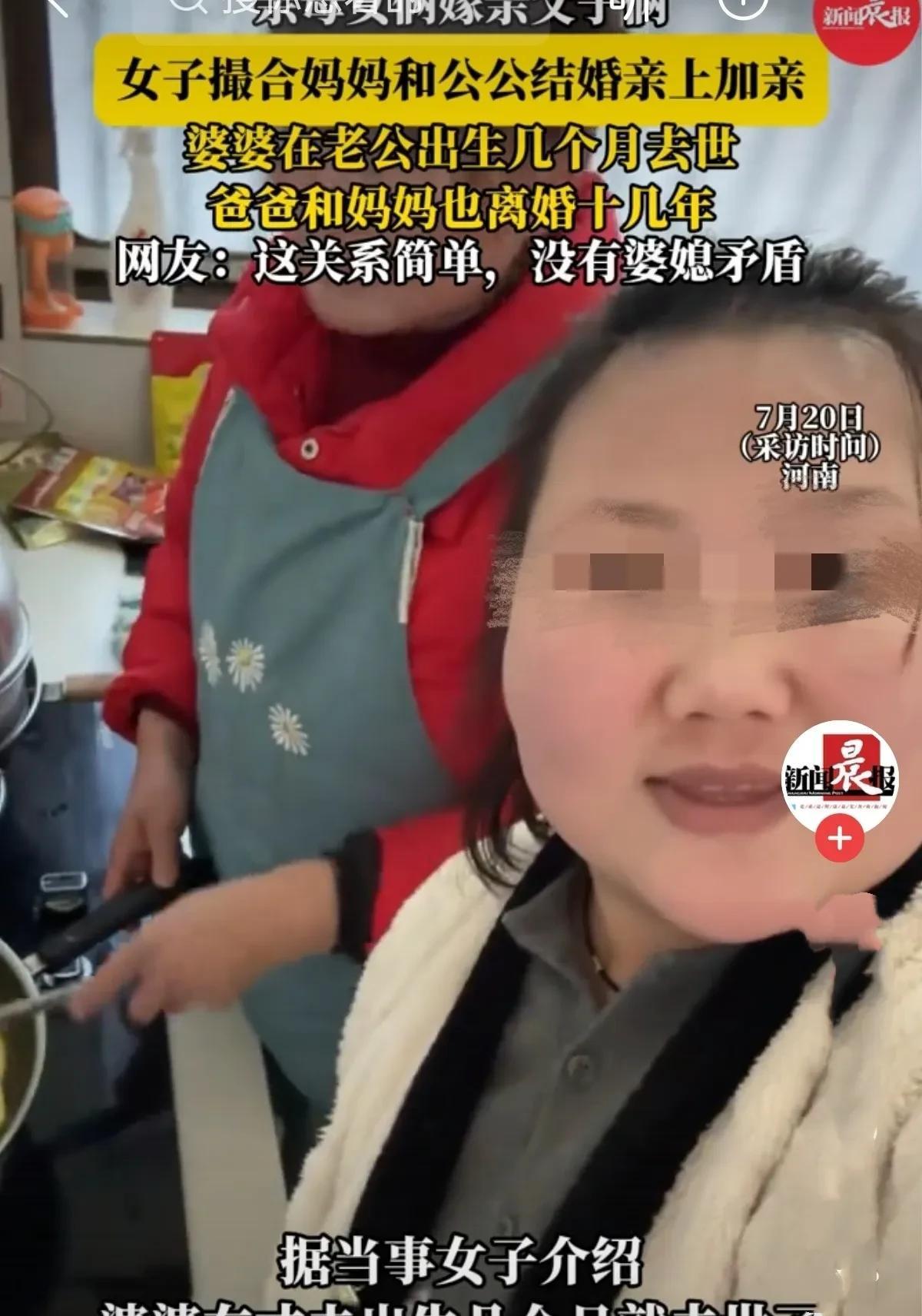 河南周口,女子与丈夫结婚后,发现公公人特别好,可他是苦命人,丈夫出生几个月时婆婆去世,公公一人把丈夫含辛茹苦养大,为他娶妻生子,成家立业默默付出,夫妻俩觉得他太不容易,想为了他找个老伴能互相照顾过好后半生。女子娘家妈离婚十几年,也是孤单度日,女子觉得公公人好,不如母女俩嫁了父子俩,肥水不流外人田!于是,在夫妻俩撮合下,两老人喜结连理!网友:这关系简单,没婆媳矛盾,挺好! 新闻晨报7月22日报道了一位网友发布的视频,讲述了亲母女俩嫁给亲父子俩这样一段令人称奇的缘分,在网络上引发了广泛关注。 莎莎嫁给憨厚本分的永生,他们的小日子过的平凡又幸福,很快,他们的儿子就出生了,更让这个家幸福升级。 莎莎没有婆婆,丈夫刚出生几个月时,婆婆就因病离开人世,从那以后,公公又当爹又当妈,独自一人含辛茹苦地将丈夫拉扯大。 公公是个勤劳善良的人,尽管生活艰难,但他始终努力给儿子最好的生活,用自己的肩膀扛起了整个家。 公公一直未再娶,他怕遇人不贤,儿子受后妈虐待,守护着家和儿子,直到他成家立业,娶妻生子。 公公仍旧默默付出,家里外头忙乎,只有在闲下来时,莎莎看到公公落寞的背影总是有种心酸和心疼。 她对丈夫说,公公的前半生都是为你活了,他虽然每天忙来忙去的,可他心里孤单啊!应该给他找个人,陪伴他幸福地过完后半生。 永生很赞同莎莎的想法,可找个啥样的呢?他怕家庭复杂了关系难处! 莎莎突然有了主意,自己父母在十几年前因感情、观念不合,选择了离婚。 这么多年,莎莎陪伴在母亲身边,可自从她结婚后,母亲独自生活倍感孤独,随后离开家出去打工,一人在外漂泊,母女俩互相牵挂着,经常电话诉说思念。 她兴奋地对丈夫说:我爸妈离婚这么多年了,我妈一个人在外面也挺孤单的。我看你爸人不错,要不咱们撮合撮合他们俩? 丈夫听了,先是一愣,随后眼睛也亮了起来:这主意好啊!要是他们能在一起,咱们这不就是亲上加亲了嘛! 小两口打定主意后,就分别行动,莎莎找娘家妈谈,永生找父亲聊。 母亲听了莎莎的建议,吃惊不小,这怎么可以,外人会笑话! 公公也满脸的不可思议,直摇头说:这都什么跟什么呀,太荒唐了!别人会说三道四的! 永生劝父亲,丈母娘人很好,你们要是能在一起,以后咱们一家人热热闹闹的,多好呀!我们也省心,双方老人都在身边,彼此照应,管别人说啥呢! 莎莎也说,妈妈是好妈妈,公公是好公公,他们一心都为儿女操劳,两个这么好的人结合,不违背人伦与法律,有什么不可? 两老人在儿女的撮合下,慢慢放下芥蒂,重新考虑此事。 两老人都是为自己儿女着想,两人结合更加没二心对孩子们,这也是好事!一家人心往一处想,劲往一处使,好好过日子多好啊! 一直关系很好的亲家,抛下世俗观念,最后接受了儿女的想法。 莎莎妈妈未要一分钱彩礼,与莎莎公公举行了简单而温馨的婚礼,正式成了一家人。 莎莎还被妈妈调侃,以后是叫她婆婆还是妈?莎莎笑着说:妈也是婆婆,婆婆也是妈! 公公笑得合不拢嘴,咱们一家人相互关爱、相互支持,小两口过得快乐,老两口过得舒心!生活过得有滋有味,剩下的只有幸福了! 有人说,亲上加亲更加亲,肥水不流外人田!懂事的女儿更懂妈妈的寂寞心!父子娶母子,好事成双,吉大欢喜! 有人说,这样挺好,老人有伴,有事能相互照应,还能一起照看小孩,儿女也不会因为父母各自另外成家带来很多麻烦,将来照顾老人也方便。 还有人说,娘俩把父子一家吃的死死的,但凡一对出现情感危机,两对都完了! 有人有不同见解,这种关糸更容易相处,没有婆媳矛盾,只要一家人恩恩爱爱,幸福快乐就好。最起码都是真心的。 《民法典》第1048条规定:直系血亲或者三代以内的旁系血亲禁止结婚。 莎莎的公公与她的母亲之间,并不属于直系血亲或三代以内的旁系血亲关系,母女与父子之间并无直接的血缘联系,他们是通过婚姻关系形成的拟制血亲,并非法律禁止结婚的血亲范围。 因此,公公与母亲婚配是非禁止结婚的血亲关系规定。 《民法典》第1069条规定,子女应当尊重父母的婚姻权利,不得干涉父母离婚、再婚以及婚后的生活。 莎莎夫妻俩,为父母的晚年生活考虑,或是也为自己赡养照顾老人考虑,把两个老人撺掇结合在一起。 如果两老人不想结婚或不看好对方,儿女无权干涉他们的婚姻,父母有自主选择婚姻的权利。 《民法典》第1069条规定:子女对父母的赡养义务,不因父母的婚姻关系变化而终止。 莎莎把公公与母亲撮合在一起,两个老人也会尽心尽力地照顾家和孩子,更重要的是,对公公和母亲的晚年赡养也减少了很多麻烦。 这段特殊的缘分,不仅让两个原本孤独的人找到了幸福的归宿,也让两个家庭紧密地联系在了一起,温暖而美好地生活在一起! 虽然网友众说纷纭,可生活过得好不好,只有自己知道! 您对这样的关系怎么看?