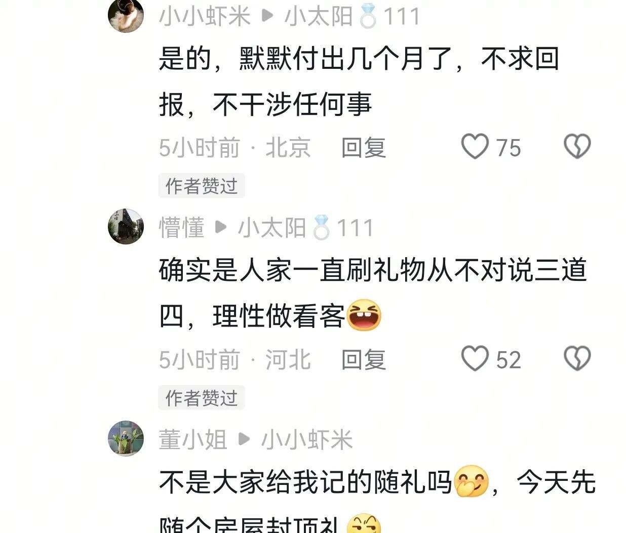 今天楼面封顶,哥哥现场直播,好多网友围观! 豪横的董小姐连刷10台跑车,这个董小姐默默支持几个月了,不求回报,哥哥直播每次都刷跑车!今天刷10台跑车,她回复:是大家的随礼!因为前面有很多网友在视频评论区说随礼多少记董小姐帐下!今天董小姐就刷了10台跑车,够豪横了! 表姐发了一个嫩南瓜炒土扎粉的视频,董小姐在下面评论,引得小小虾米等网友在下面回复。大家顺便发了一下感想,没有对比就没有伤害,有些网友刷了些礼物买了些东西,就在那指手画脚,在网上瞎哗哗,不准表姐干这个干那个,她们有话语权!董小姐默默支持几个月,她会这样做吗?没有,这就是一个人的素质! 表姐今天去舅舅舅妈家,哥哥正好在直播,表姐教舅妈在直播间点赞,舅妈又学会了一项新技能!伢子妈妈点赞可认真了,手指用力的在那一直点,都不带停歇的,有些事情还得表姐来! 那些想割裂别人亲情的,算盘打错了!#董董小姐姐#