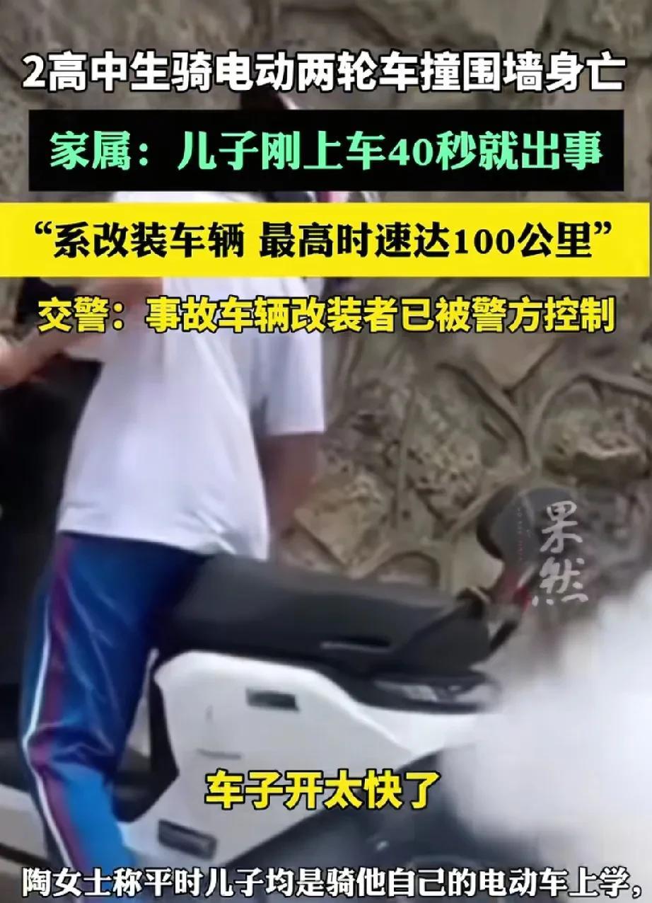 骑电动车身亡的2高中生,后座那个才15岁,本是老司机,平时上学就以电动车代步,可这次他刚坐上车40秒,就被甩墙上当场身亡。事后调查车辆是改装过的,最高时速可达100公里,目前警方已将改装者控制。 两个花季少年骑电动车撞墙而死,这既让人惋惜、又匪夷所思! 因为根据《电动自行车安全技术规范》,它的最高设计车速不得超过25km/h。另外《道路交通安全法》第58条,不论是在非机动车道内行驶,还是无非机动车道,电动车的车速都不得超过15km/h。再加上骑电动车需要佩戴好头盔。三个综合下来,即使撞墙,也不至于出人命。 从监控视频看,撞墙时的速度非常快,以至于后座男孩直接被甩起,头盔当然也没有戴。生死一瞬之间,留给两家人的是无限悲痛和各种麻烦。 后座男孩的母亲哭诉,儿子当天是去同学那里试车的,刚坐上去40秒就发生悲剧,接到电话时自己都不敢相信。因为男孩平时就是自己骑电动车上学,从来没有发生过事故,算是经验丰富的老司机了,想不到突然就阴阳两隔。 据说车子是驾车男孩父亲前一天买的,当天中午才改装好,男孩邀同学们迫不及待去外面溜达,以满足强烈的好奇心。 更有知情者还原当时场景,称原本只有驾车男孩一人耍酷,因为太轻,无法很好地磨后轮炫技,这才让那个同学坐到后面去配重,结果不知道是刹车崩了还是手滑了,连人带车一起狠狠撞墙。 非法改装电动车,这原本就是违法行为,2名高中生撞墙身亡,这和改装后电动车超高行驶速度脱不了干系,也可能和改装后的产品质量不符合安全标准有关。 明知改装行为可能导致危险,发生严重交通事故,改装者仍然进行改装,最终导致他人死亡,这就涉嫌《刑法》上的过失致人死亡罪,会根据情节轻重,判处相应的有期徒刑。 另外就是民事赔偿方面,改装者的责任亦是不可避免的,两个孩子年纪还这么小,原本未来可期,赔偿金不会是小数目,大概率会根据过错比例来承担。 两个高中生都是未成年,家人们除了丧子之痛外,相互之间也会起纠纷,监护人要承担经济赔偿责任,原本要好的两家人或就此反目! 不管是法律还是交警方面都一再强调,不能改装电动车,骑电动车要佩戴好头盔。这玩意只是一个代步工具,是“肉包铁”,速度太快发生事故,那都是非死即伤,比佩戴头盔的正常速度下,要严重太多…… 【关注@小讼言案 ,为您分享更多精彩】 (来源:果然视频)