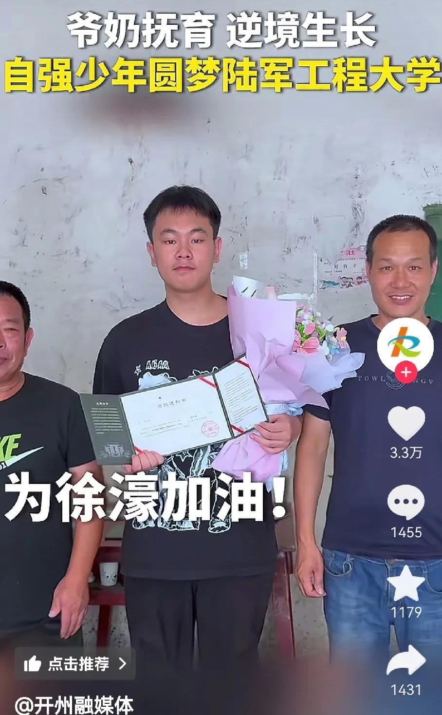 军校太适合这个孩子了。 接到录取通知书,孩子没哭,大伯哭了。 家庭变故,孩子和爷爷奶奶生活,他努力考上陆军工程大学。 以后他上学的学费生活费解决了,出来就业解决了。这样他的爷爷奶奶也没有经济压力了。另外他梦想就是保家卫国。这一路走来太不容易了。