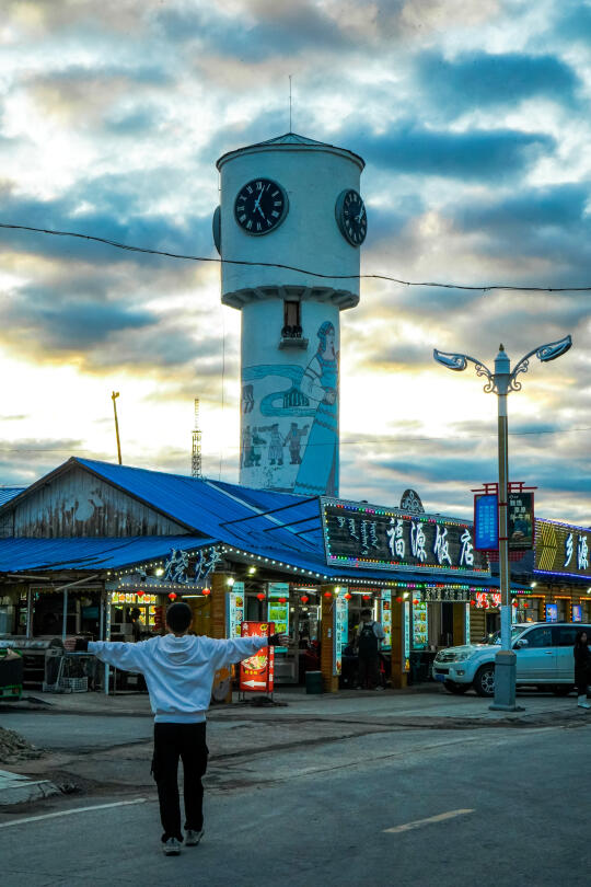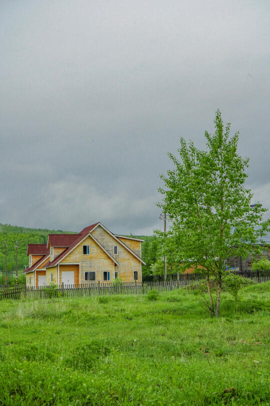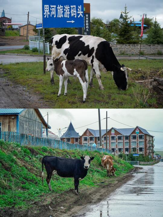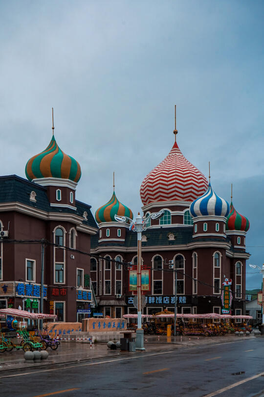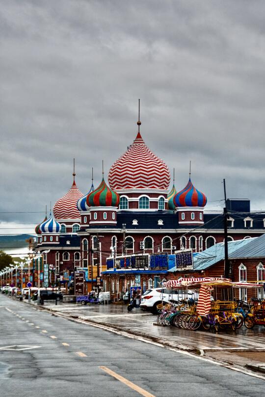 欧式城堡建筑、木刻楞屋顶、卡线边境公路