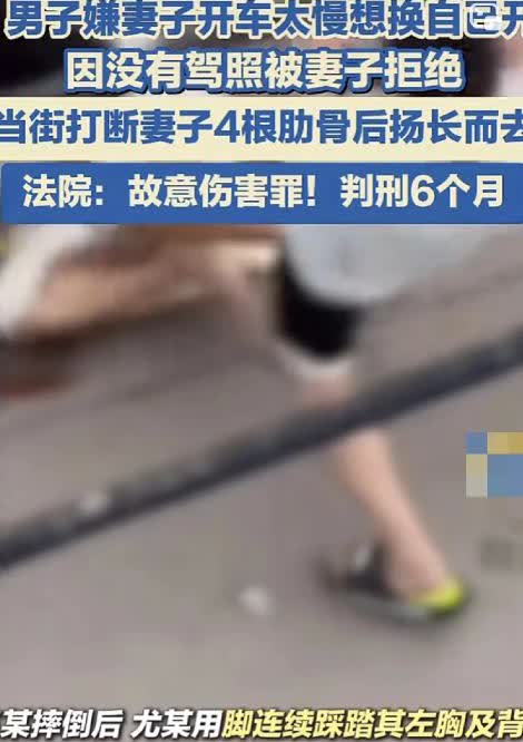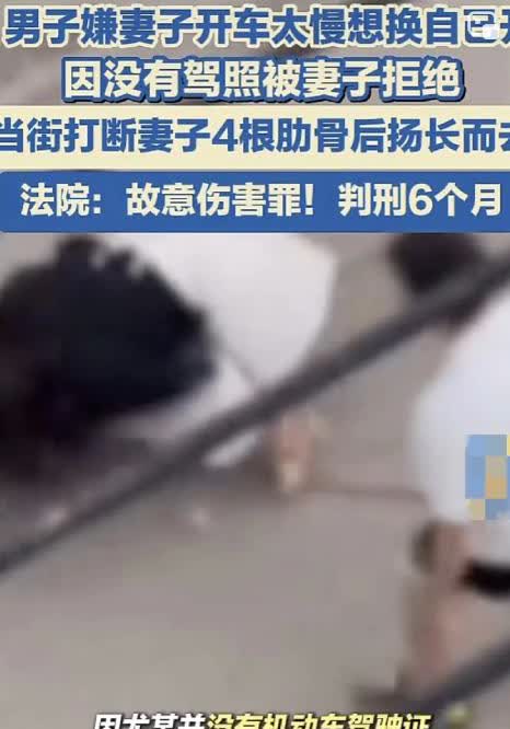 男子嫌妻子开车太慢要换自己开,因没有驾驶证被拒绝,于是当街打断妻子四根肋骨。家暴伤人后扬长而去,将妻子遗留现场,最终因故意伤害罪判刑六个月。 当街打断妻子四根肋骨,到法院获刑六个月。我觉得单是当街行凶、蔑视民众,就应该重罚,打断妻子肋骨,实属匪性大作!叫我判他,至少徒刑十年! 六个月有毛用啊,出来又继续,所以女孩们找对象一定要谨慎,不要只看外表帅不帅或有没有钱,一定要找心善的,脾气好点的。 开車慢是借口,在坏的男人,也不至于車开的慢而拳头如此伤害自己的妻子,妻子虽说打不过老公,但只要反抗,也不至于打断几根肋骨,相信总有其他原因的事情吧! 大家觉得呢?