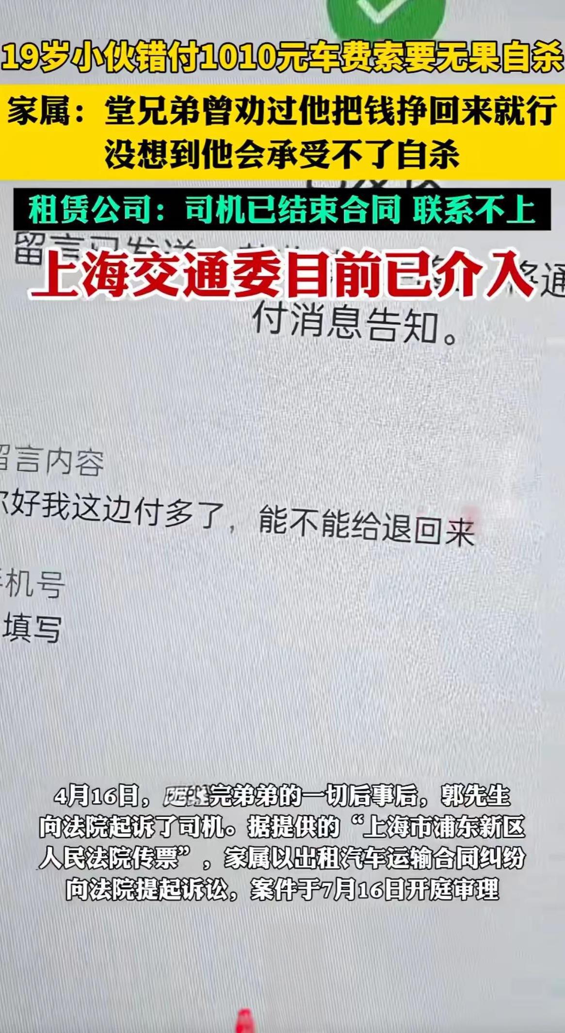 19岁男孩错付车费自杀,910块钱、成为他生命里无法承受之痛。 小时候,家里穷,妈妈总是说挣钱不容易、省着花,之类的话,慢慢的心里就开始自卑。 我相信,这个男孩也一样。在家里,经常被叮嘱、被念叨、浪费钱可耻之类的。 可我的妈妈还告诉我,如果万一遇到坏人,就把身上钱都给他,想办法先保证自己的安全。 虽然家里穷,但我的妈妈告诉我,该舍的财就舍,该吃的亏就吃,别钻牛角尖。 这19岁男孩,就是钻了牛角尖。他即便是在上海搬砖、送外卖,几天也就把钱赚回来了。 留的青山在,不怕没柴烧。 司机固然有问题,但罪不至死。 男孩用一死,换来一个公道和道歉,真是太不值得了。 才19岁,你怎么知道未来翻不了身呢?也许多年后900块只是你的一餐饭钱……