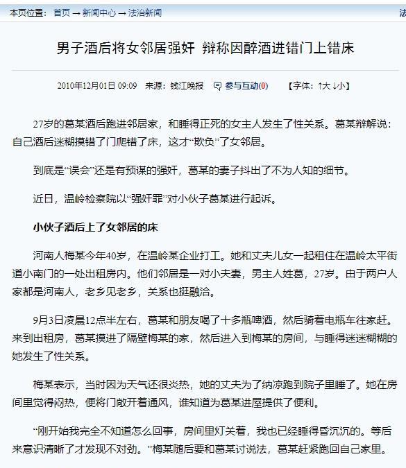 “醉酒与邻居发生关系?”河南,一男子酒后摸黑回家,结果因为酒醉走进了邻居的家中,并与女邻居发生关系,直到凌晨,女子才发现男子并非丈夫,女邻居用木棍将其打跑,并与男子对簿公堂,声称遭到男子强奸。 深夜的郑州,一场酒局后的迷雾笼罩了赵平江的生活。他醉态萌生,误入邻居家,与熟睡中的女子发生关系,直到她惊觉对方不是丈夫,挥棍赶人。这起荒唐事件迅速发酵,法庭上双方各执一词,揭开小区门锁隐患的真相。究竟是醉酒误会,还是蓄意侵犯?法律如何裁决?事件背后,隐藏着怎样的人生教训? 赵平江,38岁,郑州本地人,出生在郊区一个小村庄,家里条件一般,父母早年带着他进城打拼,父亲在工地搬砖,母亲做保洁补贴家用。他初中没读完就上了职校,学了点物流管理的皮毛,毕业后从仓库搬运工干起,靠着吃苦耐劳,慢慢爬到一家物流公司的中层,管着几十号人,月薪七八千,够养活老婆孩子。 他人长得五大三粗,平头,脸常挂着笑,爱跟朋友聚会,尤其喜欢喝两口,酒桌上总能把气氛搞得热火朝天。每年过年,他都拉着村里的发小喝酒,聊小时候偷鸡摸狗的趣事,喝高了就扯着嗓子唱老歌。他老婆是高中同学,人老实,家里有个七岁儿子,日子过得平淡但踏实。他们住的小区是个十来年的老楼,物业管理松散,楼道墙皮都掉了不少。 李芳,32岁,住在赵平江楼下的15楼。她是郑州本地人,老公常年在外地做生意,一年回来不了几次,她一个人在家带五岁女儿,平时低调,穿着朴素,头发常扎个马尾。跟邻居没什么深交,偶尔在电梯里碰见赵平江,也就点点头,没多话。她家阳台种了些绿萝和月季,闲下来就陪女儿画画,生活简单得像白开水。她家门锁跟楼上几户一样,都是开发商统一装的老款锁,后来才知道这成了事件的导火索。 事情发生在2023年7月的一个周末。赵平江跟几个发小在朋友老五家喝酒,桌上摆满啤酒瓶和白酒瓶,卤菜花生吃了一轮又一轮。赵平江喝得晕乎乎,脸红得像关公,话也开始跑偏,净说小时候的糗事。散场时已经半夜,一个发小看他走路打晃,硬是送他到小区电梯。电梯停下,赵平江挥手让人回去,自己摸着黑往家走。他以为到了16楼,掏钥匙开门,稀里糊涂进了15楼李芳家。门锁型号一模一样,钥匙居然能开,他也没多想,晃悠着就往卧室走。 李芳那天晚上睡得早,女儿在旁边小床上睡得正香。她被开门声吵醒,迷迷糊糊以为是老公回来了,没起疑。赵平江上床后,带着一身酒气靠近她,李芳没反抗,以为是自己男人。直到凌晨,月光透进来,她才看清旁边的人不是老公,吓得尖叫,抄起晾衣杆就打。赵平江挨了几下,吓得鞋都没穿就跑了,跌跌撞撞回了自己家。李芳报了警,警察很快上门,把赵平江带走。现场勘查发现,门锁问题让赵平江误入,成了案件的关键点。 赵平江被带到派出所后,清醒了不少,反复跟警察解释,说自己喝多了,认错家,以为自己老婆在床上,压根没想干坏事。李芳却一口咬定赵平江是故意侵犯,害她受了巨大伤害。警察查了小区监控,确认赵平江醉酒后走错楼层,钥匙能开李芳家门也核实了,但这事到底算不算犯罪,还得法院说了算。消息在小区传开,邻居们议论纷纷,有人觉得赵平江是无心之失,有人觉得他活该,谁让他喝那么多。 法庭上,赵平江低头站在被告席,衬衫皱得像咸菜,肩上还有被打的痕迹。他律师拿出了监控视频,证明他醉酒后走错楼层,还强调门锁问题是个隐患。赵平江一口咬定自己没恶意,以为是自家老婆,没用暴力。李芳坐在原告席,双手紧握,讲到事件经过时声音发抖,说自己被吓得睡不着觉,生活全乱了。 法院查清,小区开发商装的门锁型号太老,存在安全问题,赵平江的钥匙能开李芳家门,纯属意外。按《刑法》第236条,强奸罪得有暴力或胁迫,证明违背被害人意志,但李芳一开始没反抗,以为是老公,所以这罪名定不了。不过,法院根据《民法典》第1183条,认定赵平江的行为给李芳造成精神伤害,判他赔5万块,包括精神损失费和其他费用。 判决后,李芳没闲着,找律师起诉了开发商,追责门锁问题。小区物业挨了批评,赶紧换了新锁,楼道里还贴了告示,提醒大家检查门锁。赵平江赔了钱,带着老婆孩子搬走了,新家在郑州另一头,楼盘新,物业也靠谱点。他从那以后很少喝酒,朋友聚会也推了大半,怕再惹事。李芳老公听说这事,辞了外地的工作,回来陪她,家里多了点生气,阳台的花草也重新收拾得漂漂亮亮。她还找了心理医生,慢慢调整状态,想把这事彻底放下。 这事让人看了直摇头,喝酒这事真得悠着点。赵平江一个不小心,毁了自己平静的日子,还给李芳添了堵。法律给了个说法,但生活还得继续。门锁的事也提醒大家,住老小区得留个心眼,检查下自家锁头,别等出了事才后悔。你说这事怪谁?是赵平江酒后糊涂,还是开发商偷工减料?欢迎留言说说你的看法,大家一起聊聊怎么避免这种糟心事!